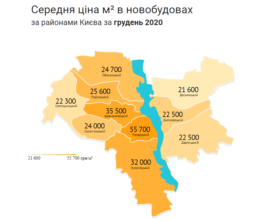 Как и всегда, самая дорогая недвижимость строилась в новостройках Печерского района (средняя цена — 55,7 тыс. грн за кв.м), а самые дешевая — в Деснянском (средняя цена — 21,6 тыс. грн за кв.м).