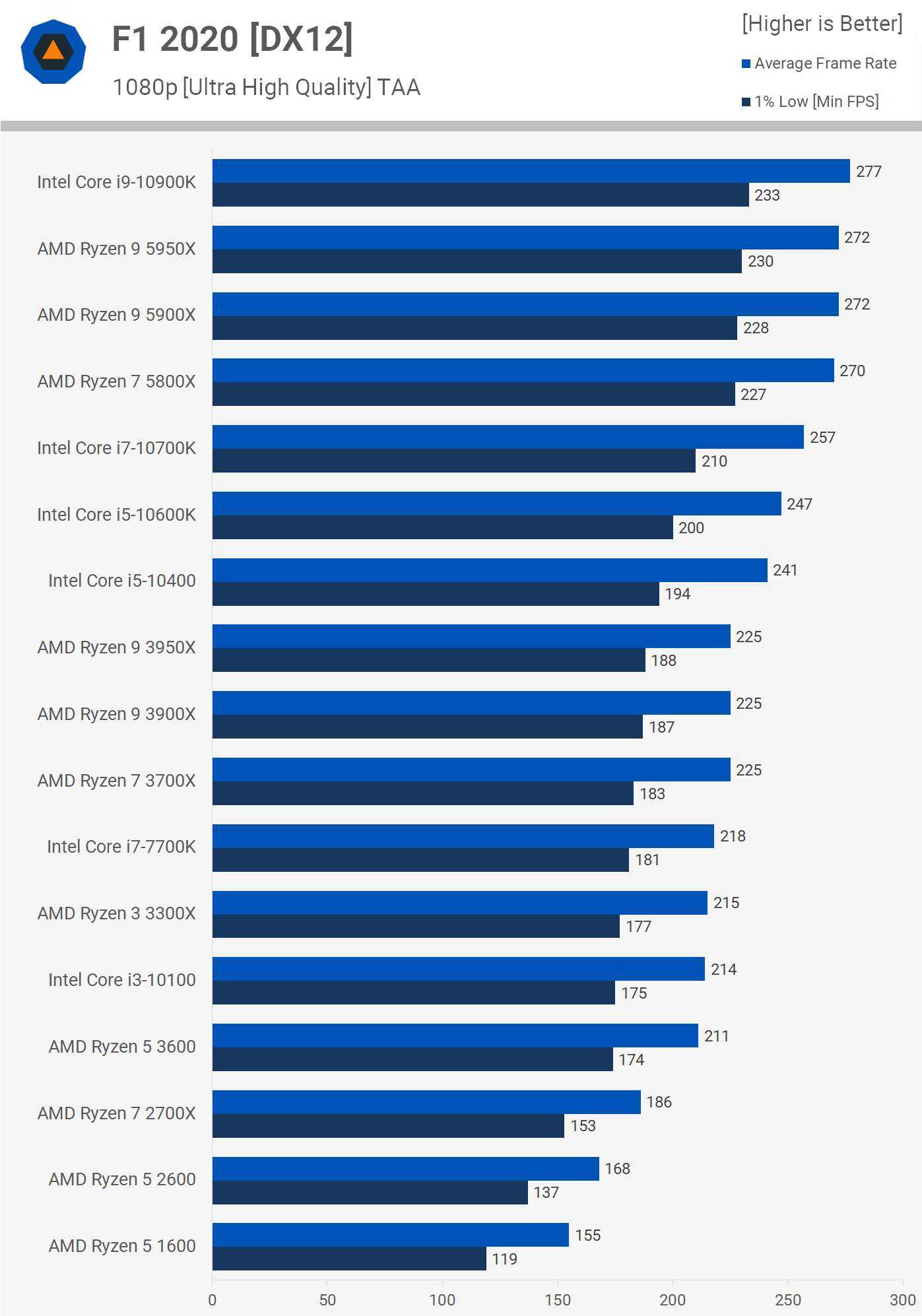 5800X был быстрым в F1 2020, опередив своего предшественника на 20% и даже опередив 10700K на 5%. В основном он соответствовал 5900X и 5950X, отставая от 10900K всего на 3%.