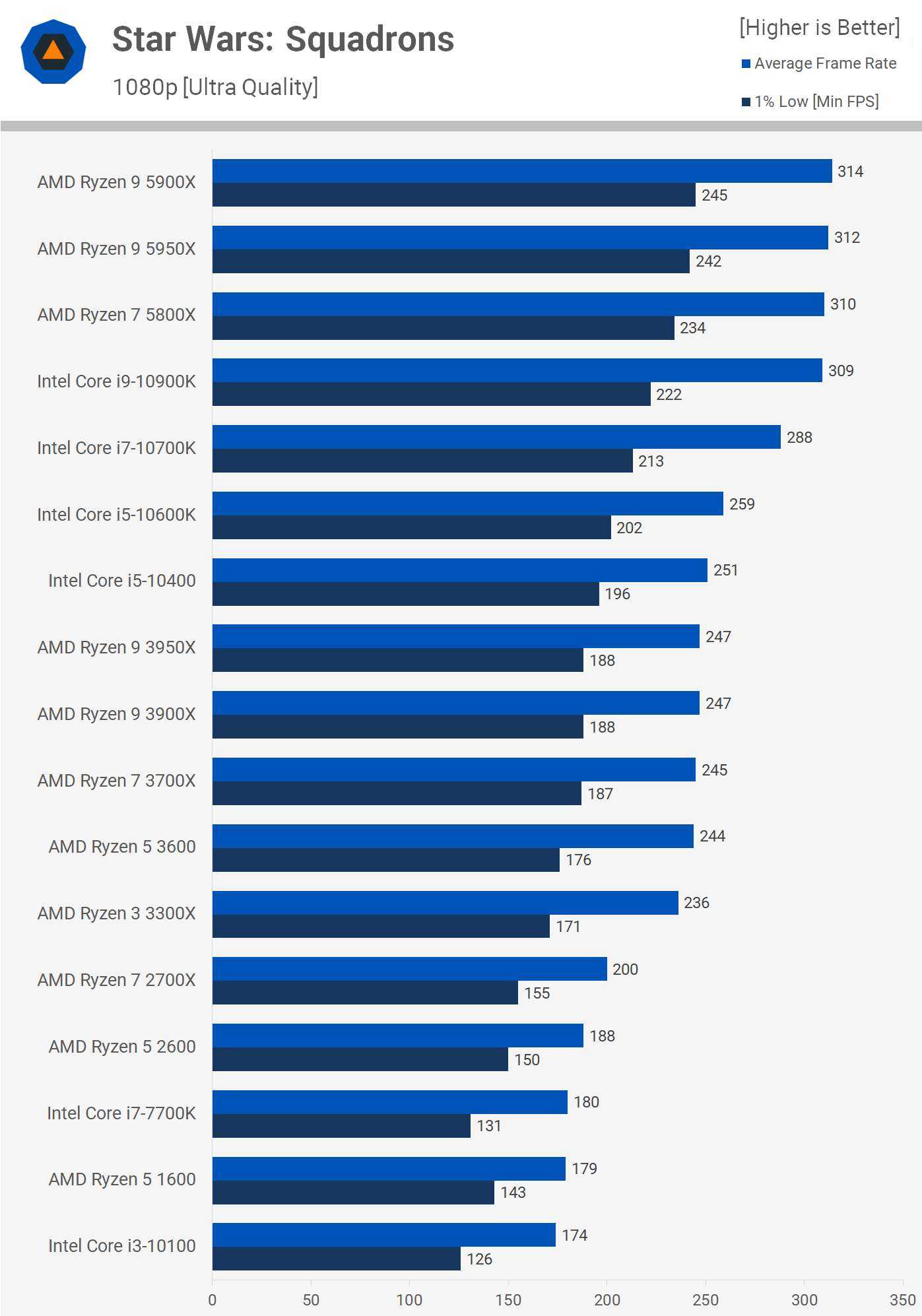 5800X хорошо показал себя в Star Wars: Squadrons, в основном соответствуя части с большим количеством ядер, чтобы соответствовать 10900K и превзойти 10700K на 8%. Мы также ожидаем увеличения производительности на 27% по сравнению с 3700X.