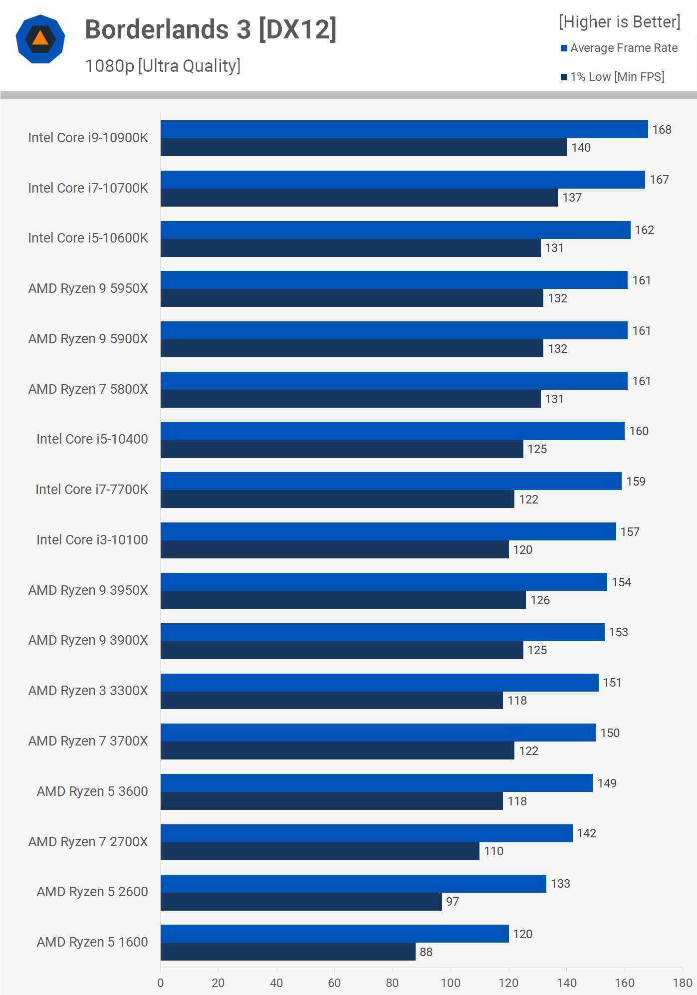 Прирост в Borderlands 3 менее впечатляющий, здесь 5800X был на 7% быстрее, чем 3700x, а это означало, что он был немного медленнее, чем конкурирующие компоненты Intel. Однако он был всего на 4% медленнее, чем 10700K, что мы обычно считали ничьей.