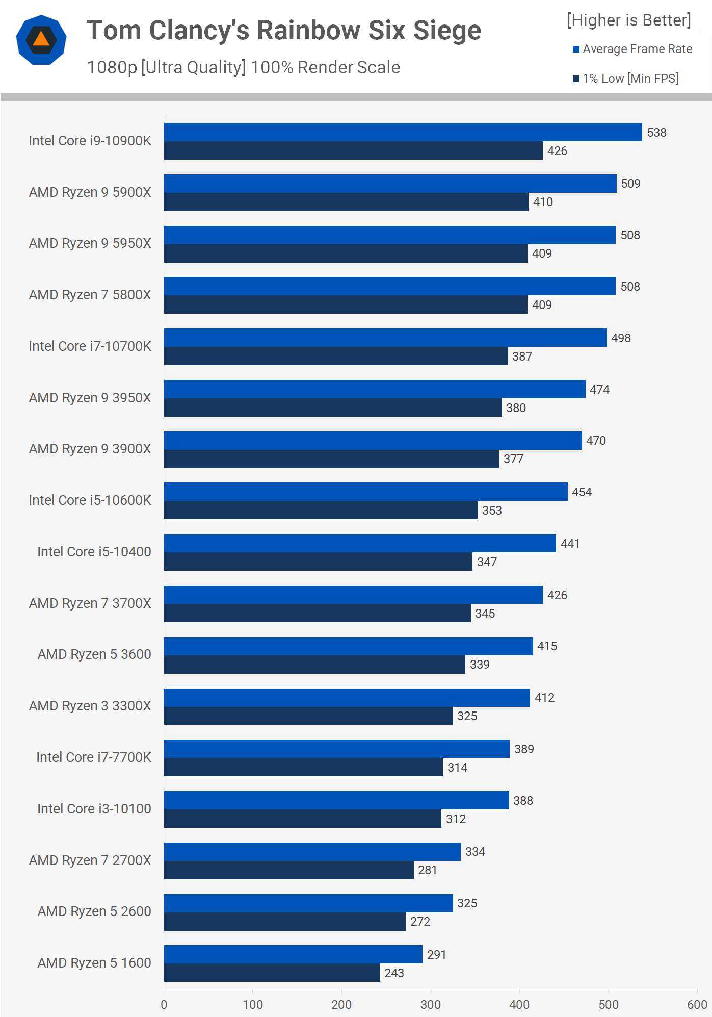 Хорошая производительность в Tom Clancy’s Rainbow Six Siege. 5800X соответствует более дорогим процессорам Zen 3 со средней скоростью 508 кадров в секунду. Это сделало его на 2% быстрее, чем 10700K, и на 19% быстрее, чем у 3700X, что стало еще одним большим скачком производительности в поколении.