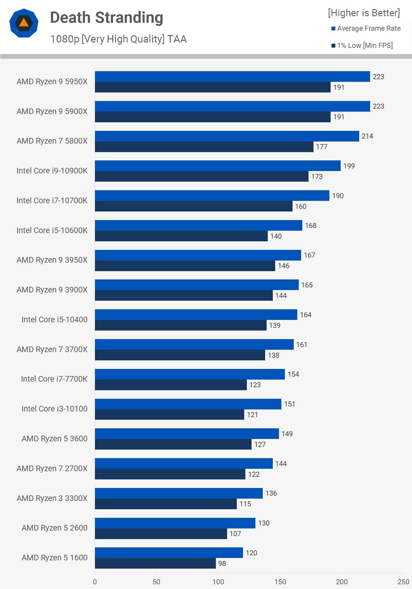 Где мы не видим ничьей, так это в Death Stranding, здесь 5800X был на 12% быстрее, чем 10700K, и вам будет сложно восполнить этот запас за счет разгона Core i7. 5800X также на 33% быстрее, чем 3700X, и это здорово, хотя теперь, посмотрев на 5900X и 5950X, мы начинаем становиться избалованными, наблюдая за такими границами.