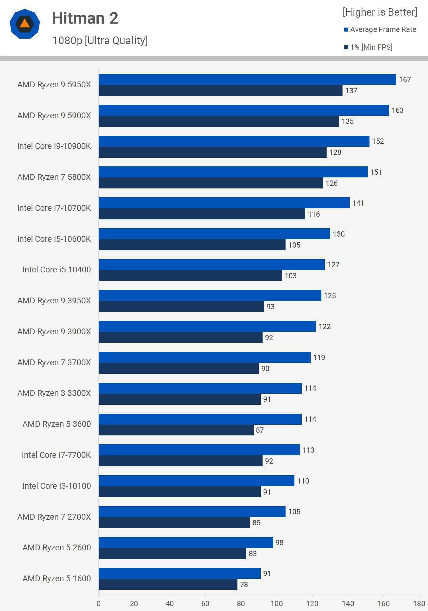 Интересно, что 5800X не так впечатляет, как 5900X и 5950X в Hitman 2, выдвигая RTX 3090 до 151 кадра в секунду при разрешении 1080p, ставя его на один уровень с 10900K. Конечно, неплохой результат, но мы также не ожидали, что он будет на 7% медленнее, чем 5900X.