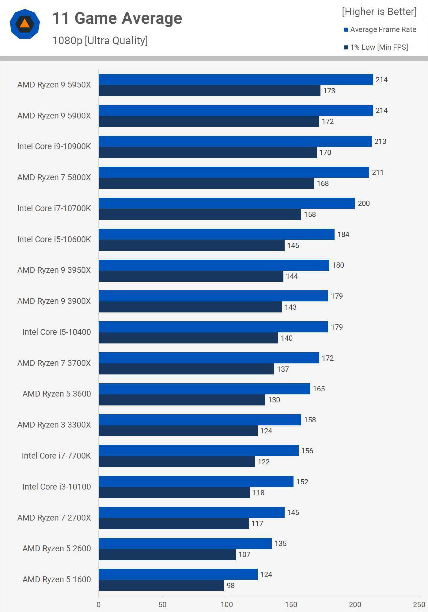 Теперь, если мы усредним игровую производительность, наблюдаемую по всему нашему образцу игр, мы обнаружим, что 5800X примерно на одном уровне с 10900K и по большей части не намного медленнее, чем 5900X и 5950X. Он также на 6% опережает Core i7-10700K и на 23% опережает более старый 3700X.