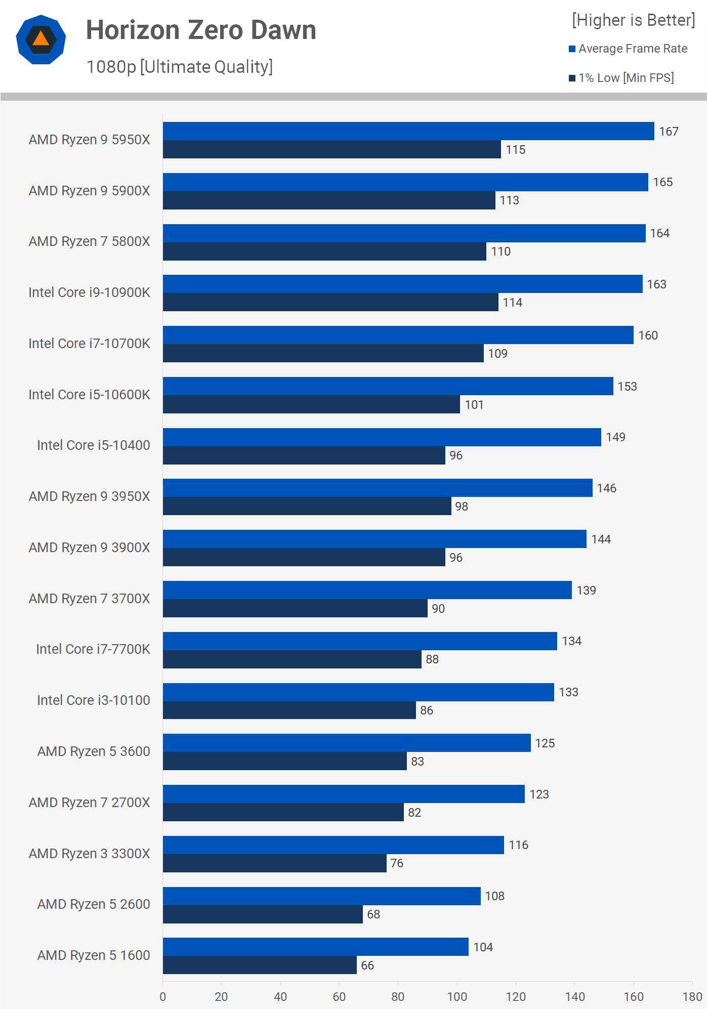 Как было замечено ранее с 5900X и 5950X, Zen 3 предлагает солидную производительность в Horizon Zero Dawn, а 5800X пропускает всего несколько кадров по сравнению с моделями более высокого уровня. Это означало, что он был на 3% быстрее, чем 10700K, что соответствовало уровню производительности Core i7, и это стало возможным благодаря увеличению производительности на 18% по сравнению с 3700X.