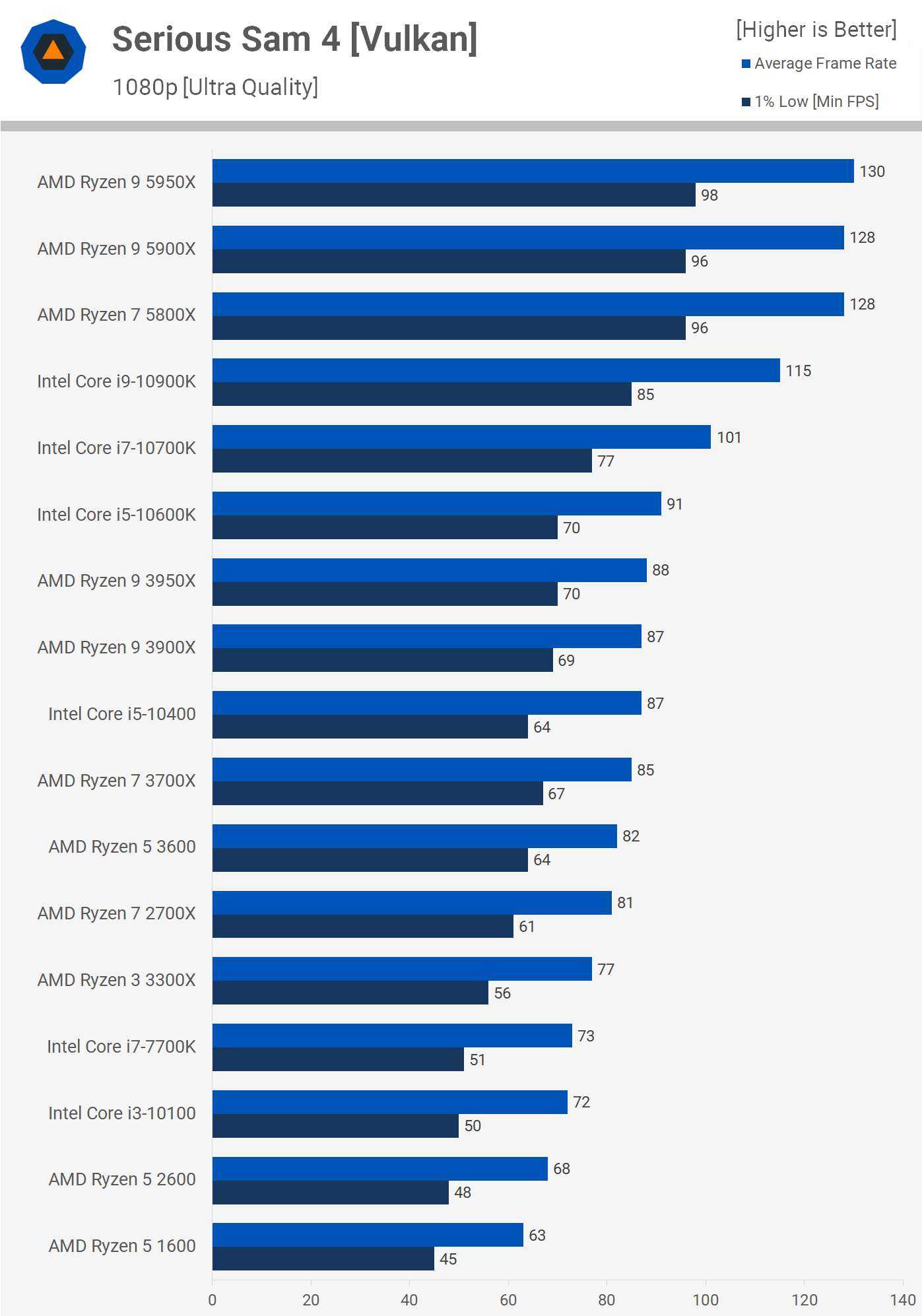 Наконец, у нас есть Serious Sam 4, где 5800X соответствует 5900X и 5950X с производительностью, которая ставит его на 11% выше 10900K и на колоссальные 27% перед 10700K. Более того, мы ожидаем безумного увеличения производительности на 51% по сравнению с 3700X.