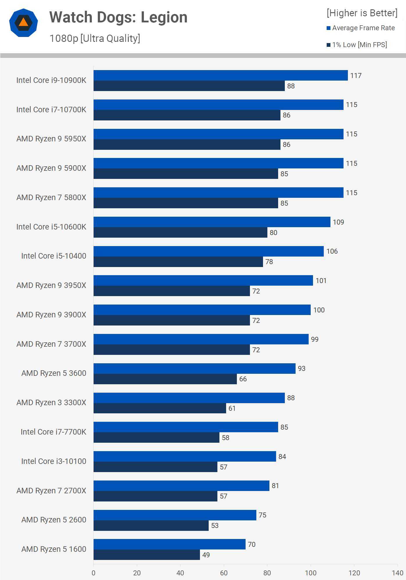 Мы также планируем повысить производительность Watch Dogs Legion на 16% — с 99 до 155 кадров в секунду. 5800X соответствует старшим 12- и 16-ядерным моделям, а также Intel 10700K и 10900K.