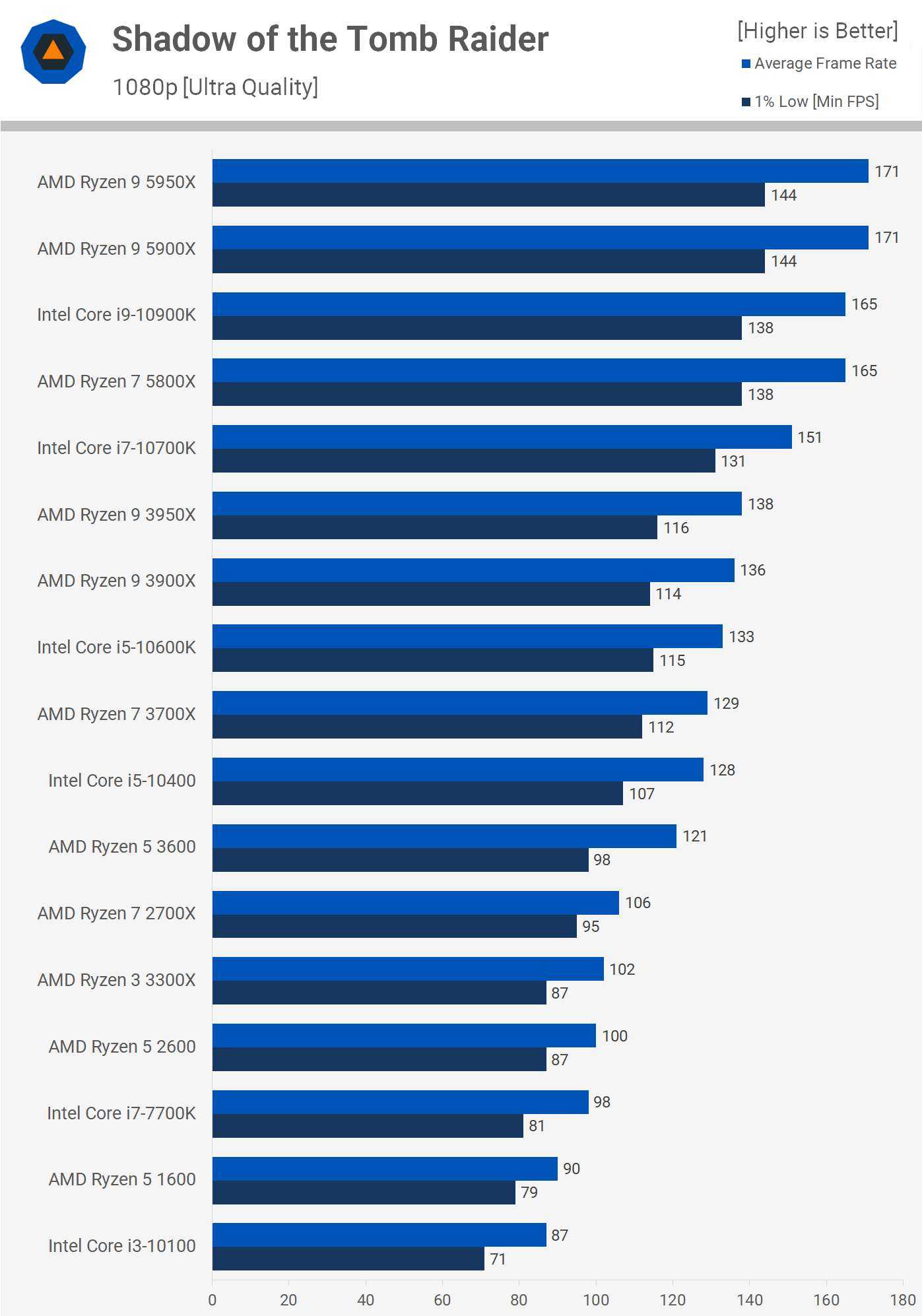 5800X удалось сопоставить 10900K в Shadow of the Tomb Raider со средней скоростью 165 кадров в секунду, что сделало его на 28% быстрее, чем 3700X, и на 9% быстрее, чем у 10700K, в то время как он был всего на 4% медленнее, чем более дорогой Zen 3. базовые модели.