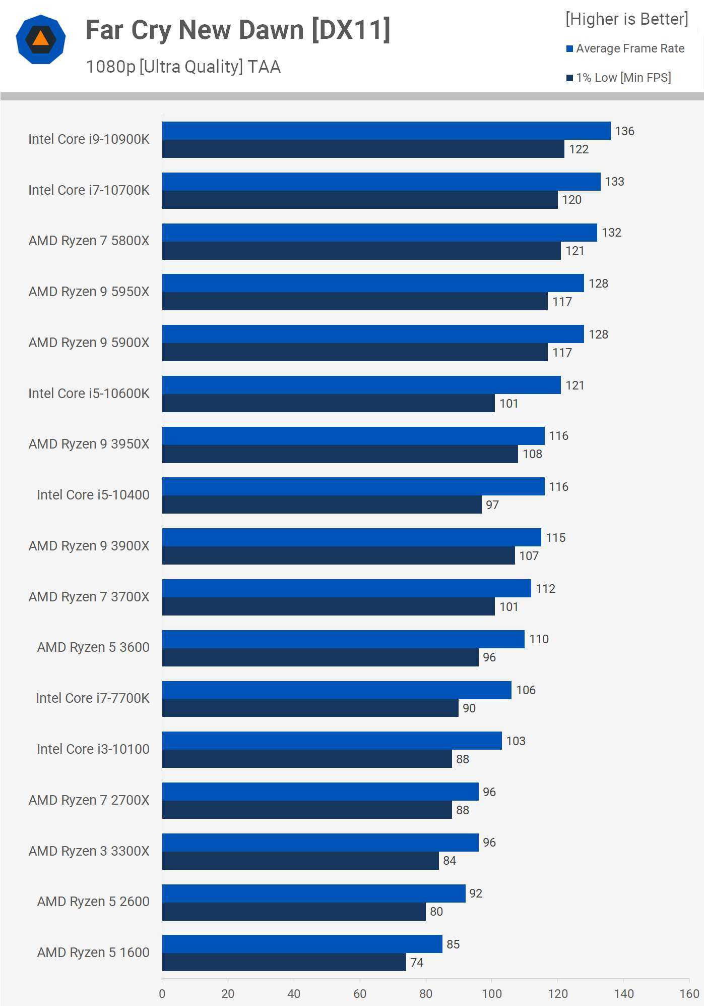 Для наших игровых тестов мы использовали RTX 3090 от Nvidia. Сначала проверяя Far Cry New Dawn, мы обнаруживаем, что в этой чувствительной к задержке игре 5800X на шаг быстрее, чем 5900X и 5950X, в основном он соответствует 10700K, что делает его медленнее всего на 3% чем 10900К.