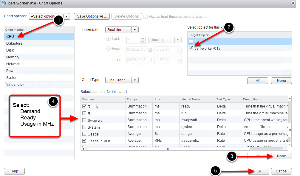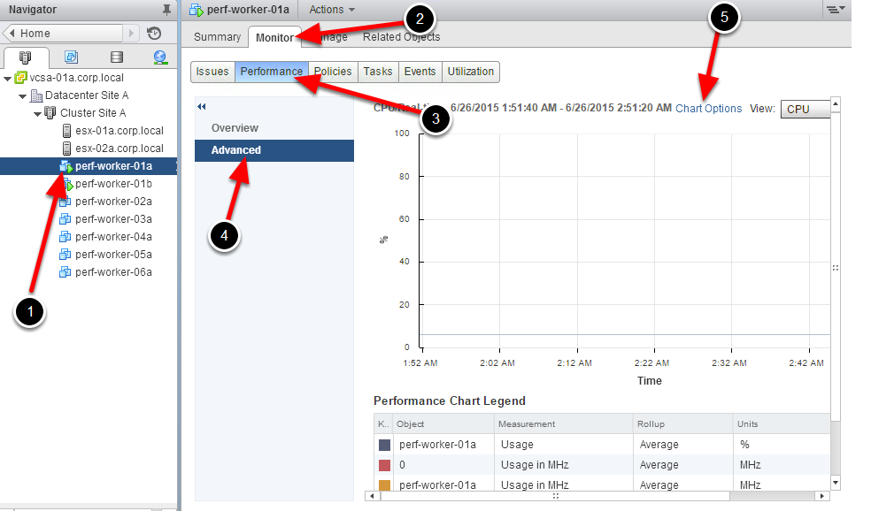Переключаемся в окно vSphere, переходим в закладку мониторинга производительности машины PERF-WORKER-01A. Поскольку интересны расширенные параметры, необходимо выбрать опцию Advanced –> Chart Options.