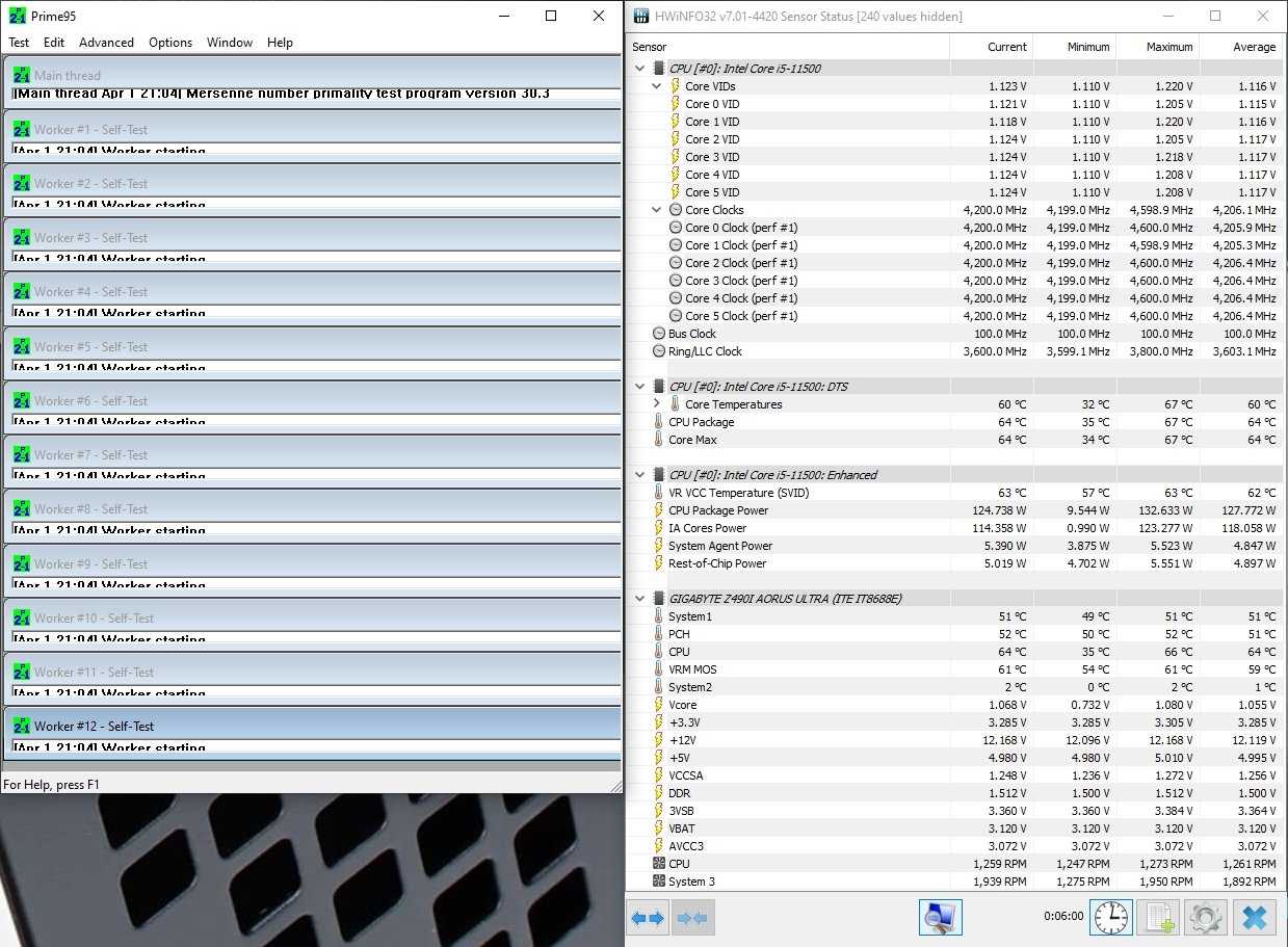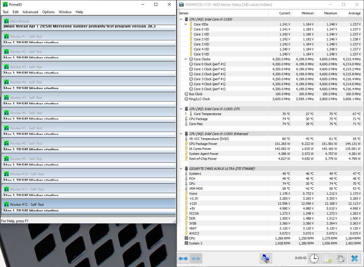 Немаловажными моментами в работе процессоров Rocket Lake являются энергопотребление и нагрев новых CPU. Учитывая наличие инструкций AVX-512 у процессоров Intel Core 11-поколения, мы рассмотрели характер работы этих процессоров в различных условиях. В случае с Core i5-11500 запускаем на 5 минут стресс-тест Prime95 с поддержкой AVX-512 и смотрим на пиковые значения при полной нагрузке. Процессор Core i5-11500 сохраняет работоспособность всех шести ядер на частоте 4.20 ГГц. При этом его энергопотребление составляет 151 Вт, а максимальная температура — 75 ℃.