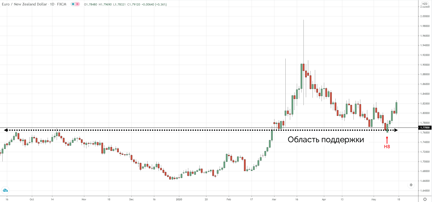 Как вы можете видеть, недельный таймфрейм находится в восходящем тренде, а 1.7700 – это область, где предыдущее сопротивление могло стать поддержкой.