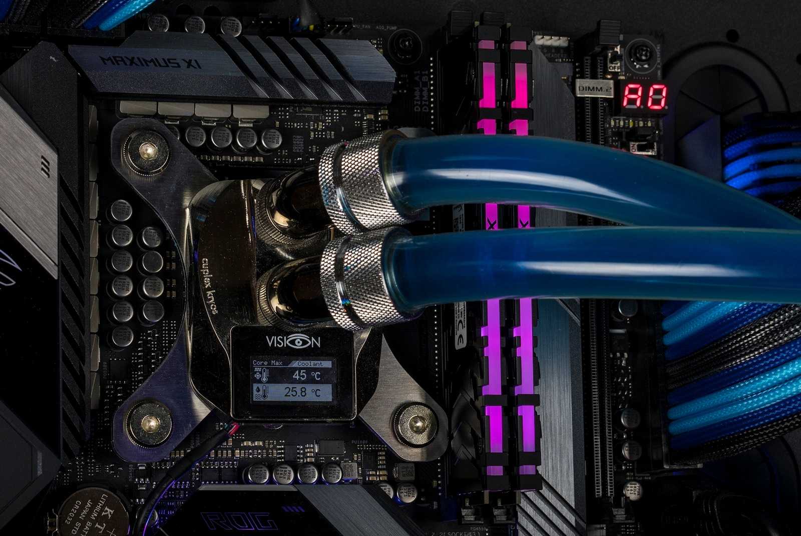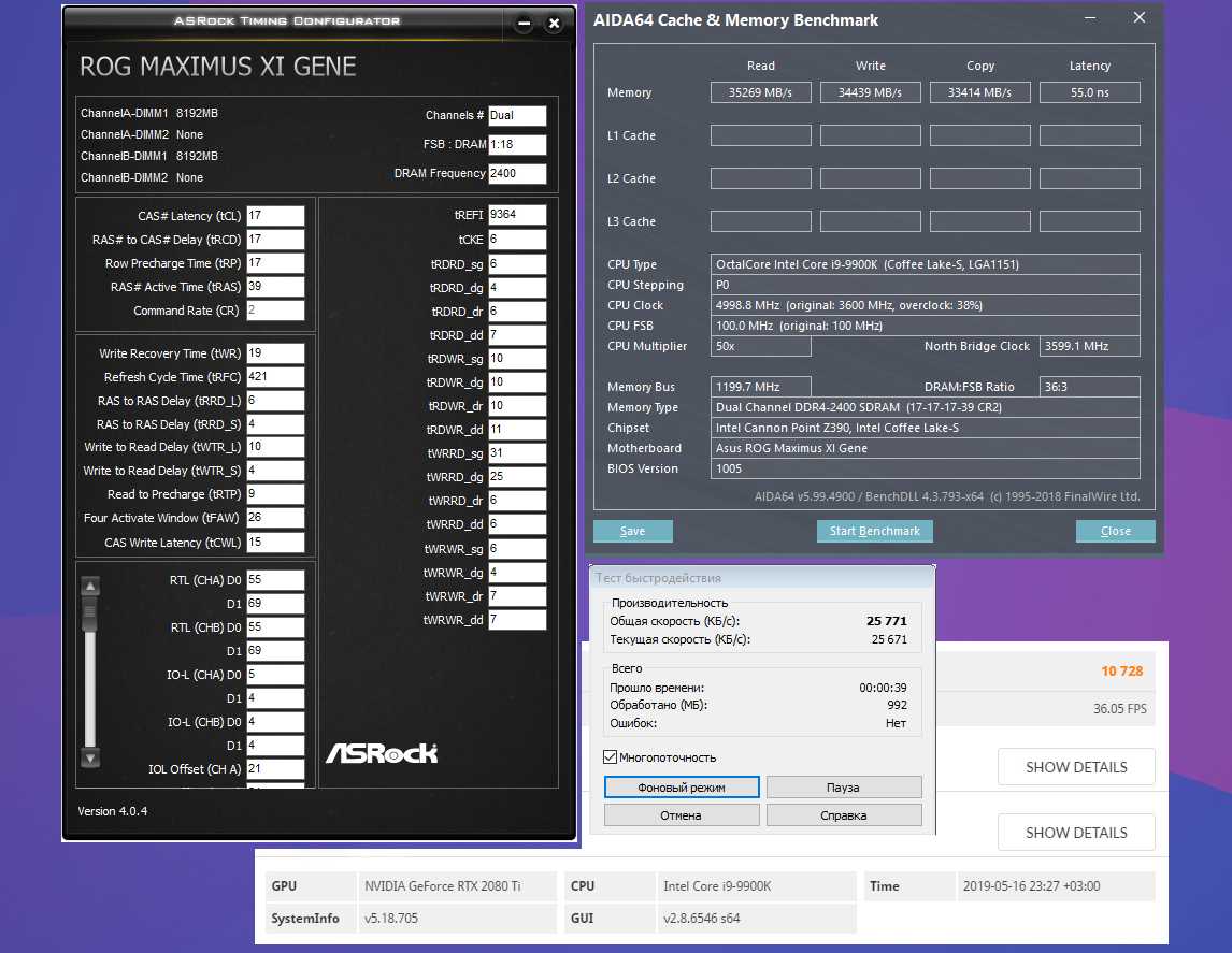 - Процессор: Intel Core i9-9900K в разгоне всех ядер до 5000 МГц при напряжении 1.22 В (частота кольцевой шины 4700 МГц);
