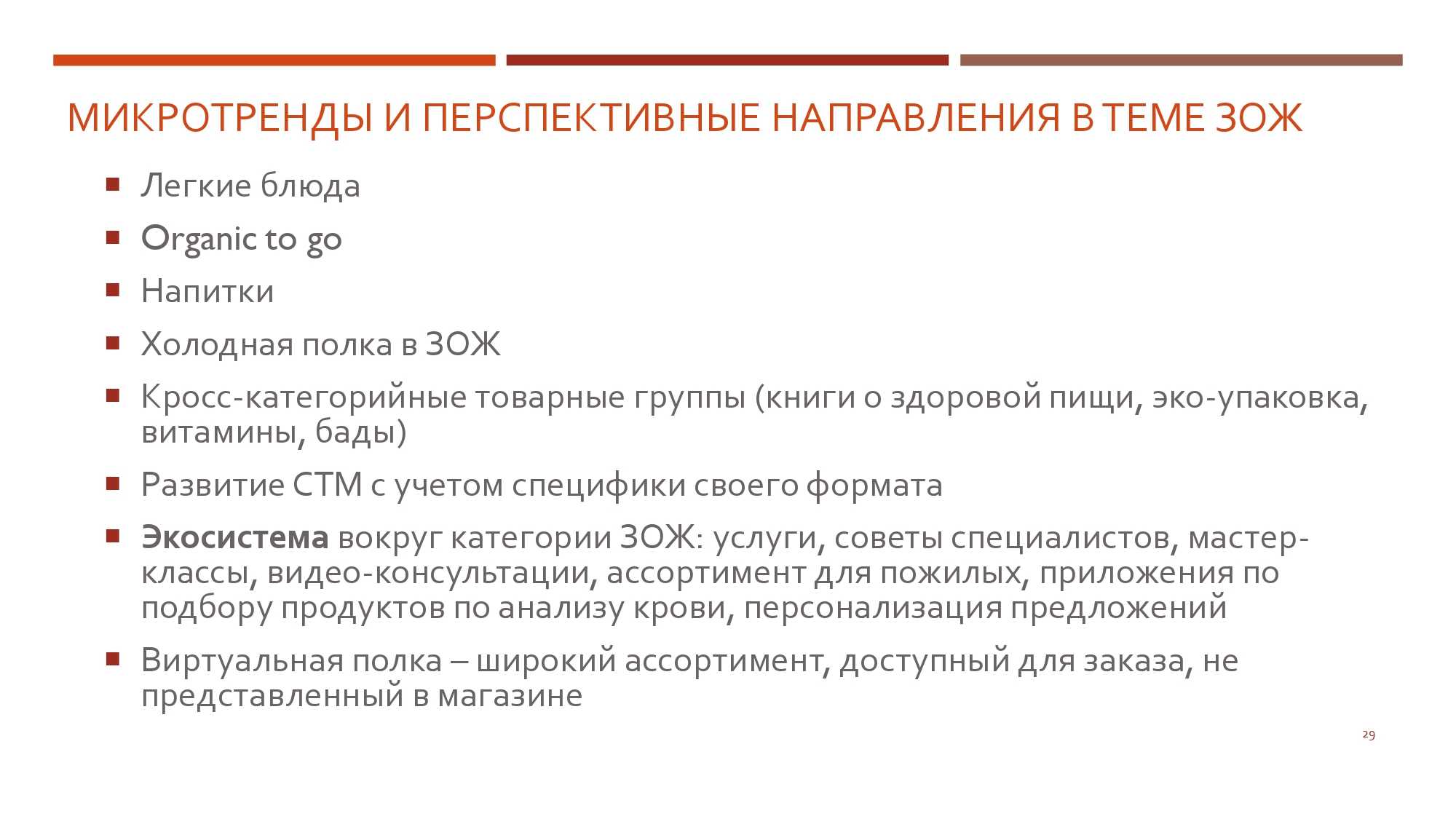 В перспективе ритейлерам важно развивать и микро-сегменты: легкие блюда, ассортимент для пожилых людей, «био» и «органик to go», напитки и холодную полку в ЗОЖ.