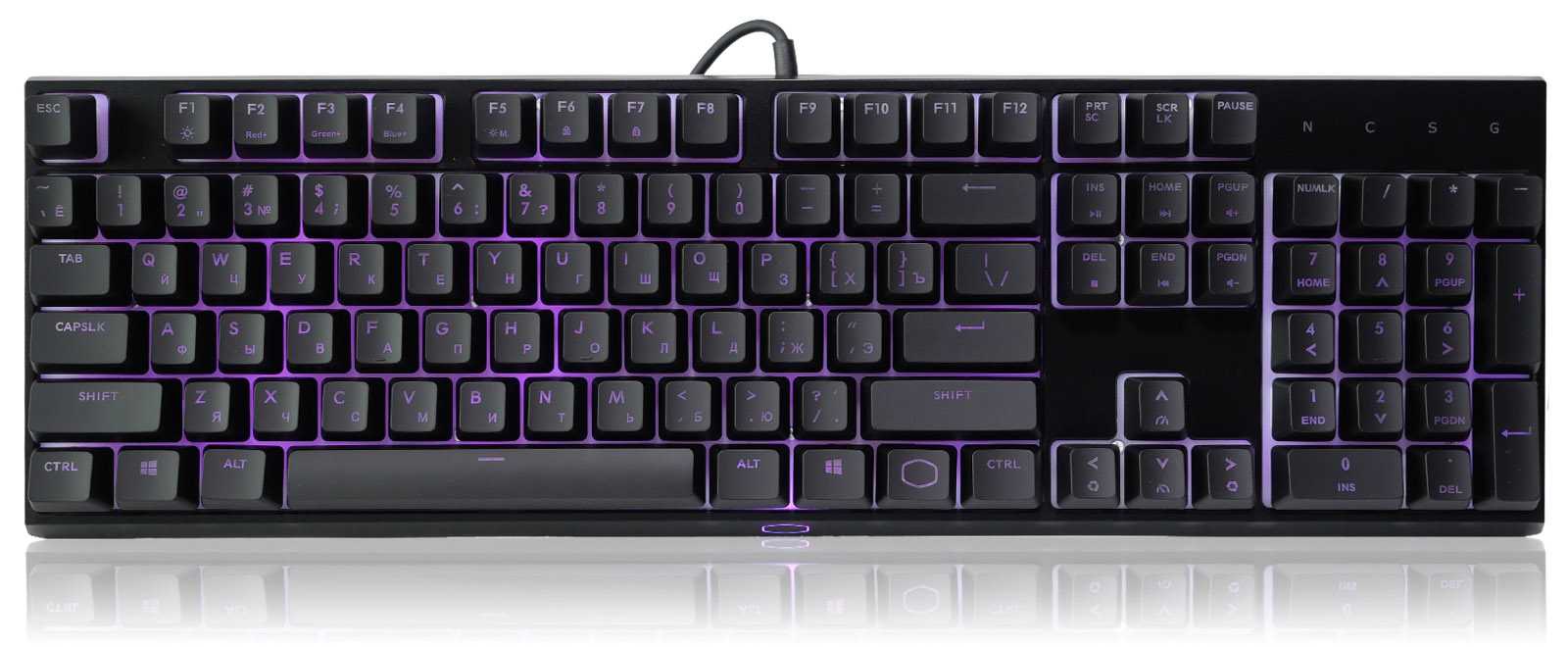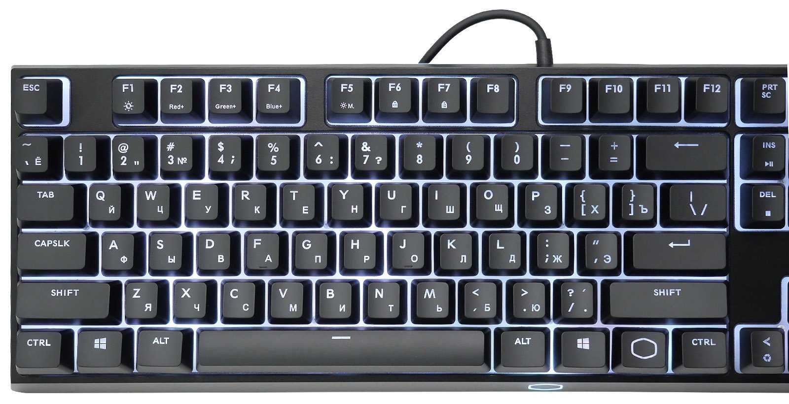 Применена раскладка ANSI, для которой характерен вытянутый однорядный ENTER, удлиненные клавиши SHIFT и BACKSPACE, а также равнозначные ALT. На часть функциональных клавиш закреплены дополнительные функции управления мультимедиа и подсветкой, которые срабатывают при одновременном нажатии с клавишей Fn, на кейкапе которой нанесен контур логотипа Cooler Master. Всё интуитивно понятно по дополнительным значкам на них.