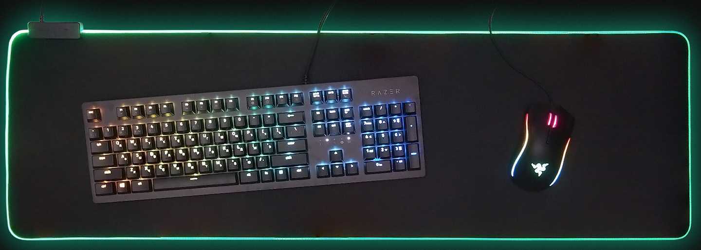 Начну с игрового коврика Razer Goliathus Extended Chroma. Его приобретение не было спонтанным решением. В арсенале домашних ПК некоторое время я уже использовал более компактный вариант — Razer Goliathus Chroma. Мне в нём нравилось всё: приятная на ощупь фактура поверхности, четкая работа сенсоров, легкое и предсказуемое скольжение мышек, а также отличная работа подсветки. Поэтому приобретение более крупного варианта Extended было лишь делом времени. Размещение клавиатуры на коврике такого нескромного размера добавило удобства пользования. Во-первых, на моём столе не так много месте по глубине, поэтому клавиатуру пришлось брать без подставки под руки, а проводить времени за ПК приходится много. Этот момент сгладил коврик, ведь упираться запястьем в мягкую поверхность намного комфортнее, чем в твердую столешницу, руки меньше затекают и устают. Во-вторых, он полностью исключил малейшие предпосылки к сдвигу клавиатуры под давлением рук. В этом плане у Razer Huntsman, итак, всё неплохо благодаря широким резиновым ножкам на основании, но на коврике всё стало еще монолитнее. В третьих, лично мне импонирует мода на яркую RGB-подсветку в компьютерных девайсах. Светящийся синхронно с эффектами на других устройствах контур Razer Goliathus Extended Chroma отлично вписался в получившийся игровой сет. К недостаткам отнесу лишь достаточно маркую однотонную черную поверхность. Всё-таки на ковриках с рисунком пыль и грязь менее заметны со временем.