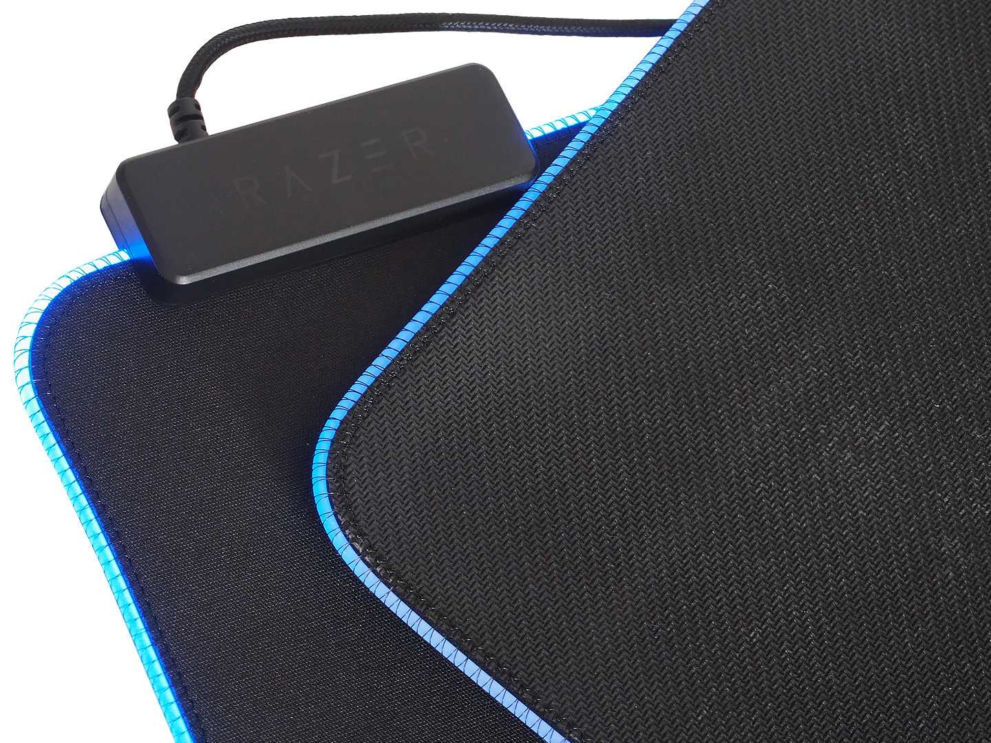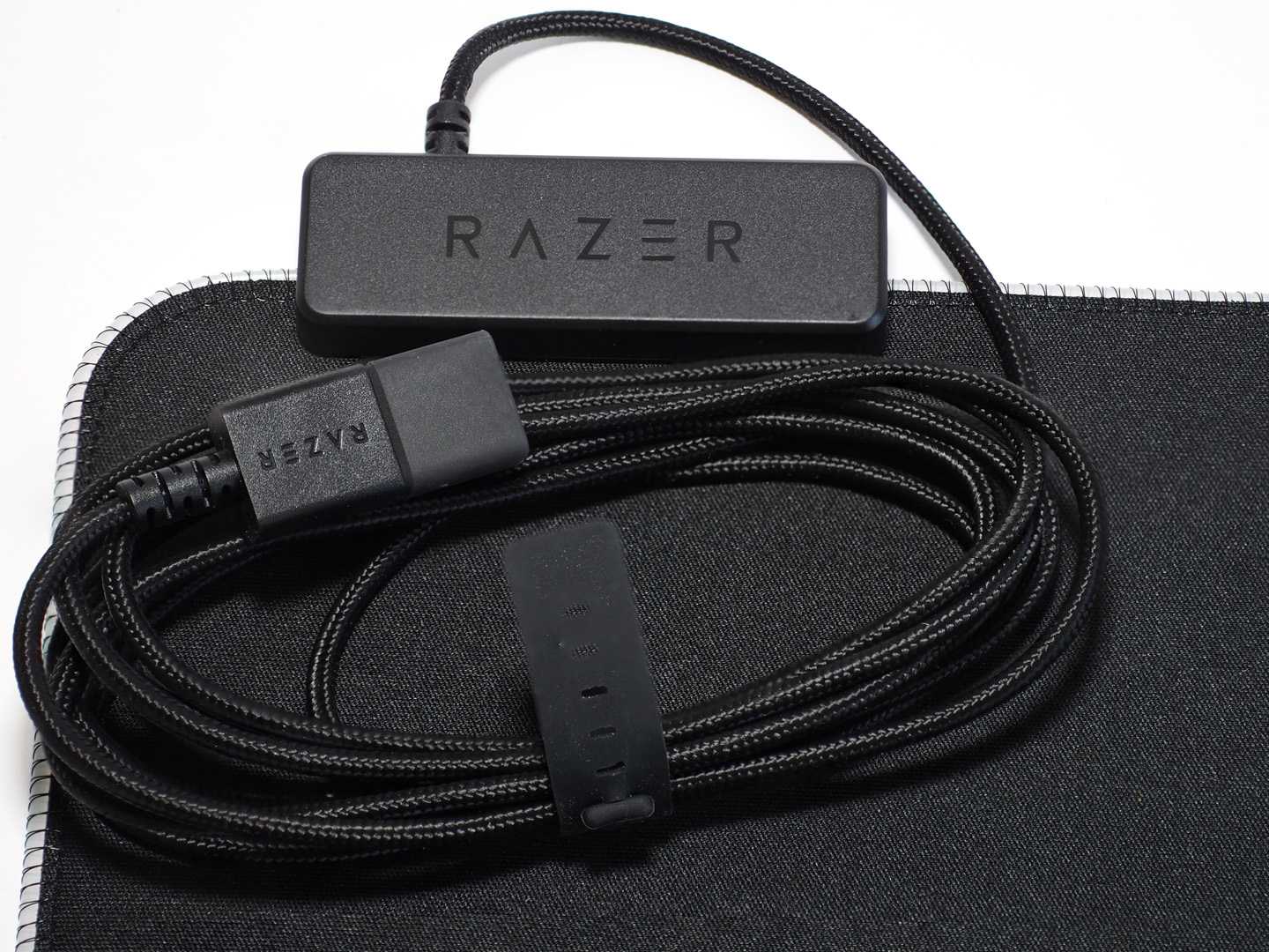 В левом верхнем углу закреплен блок управления подсветкой по периметру, но в отличие от младшей модификации Goliathus Chroma на нём не стали делать держатель для кабеля, хотя для клавиатуры или гарнитуры он мог бы пригодиться. Провод питания от USB-порта длинный, 2,1 метра. Даже учитывая защитную оплетку, его диаметр небольшой — в пределах 3 мм. На конце штекер с обязательным упоминанием производителя и защитным колпачком. Используется и съемная резиновая многоразовая застежка для фиксации излишков кабеля.