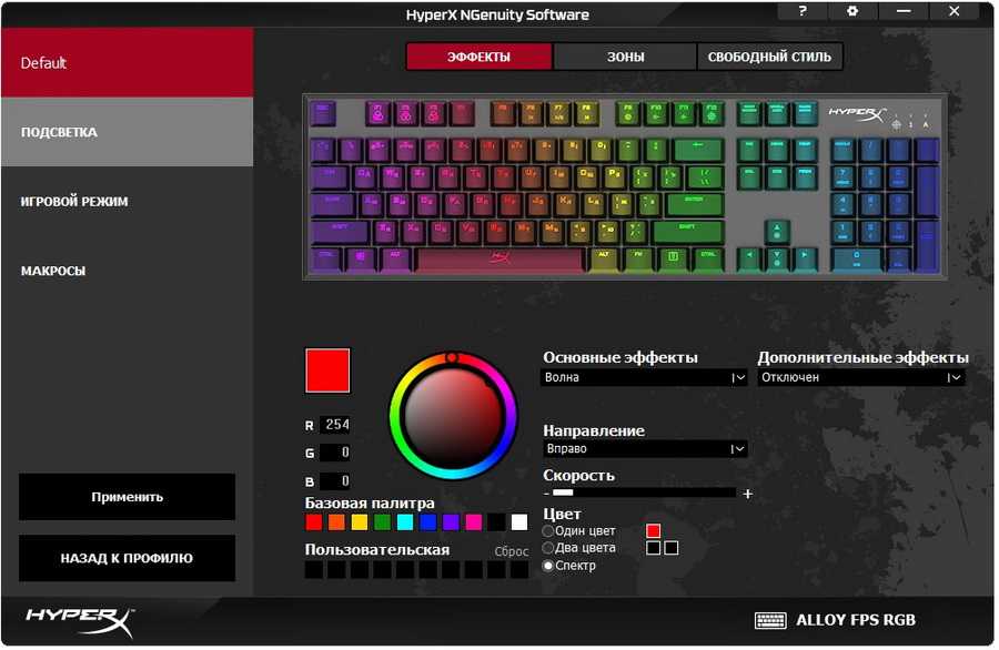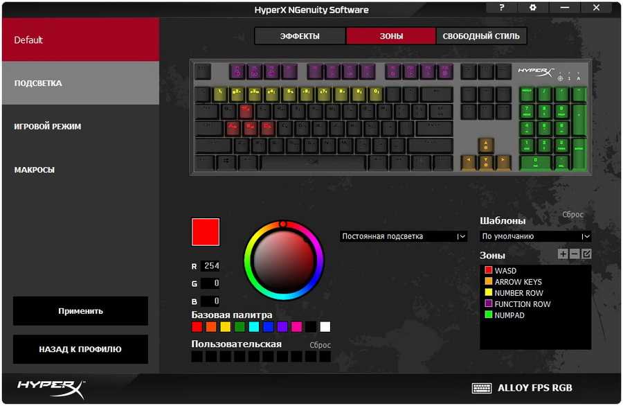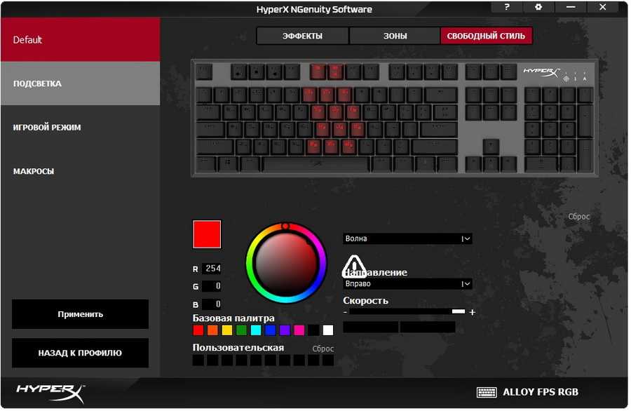 Первый раздел настроек – подсветка. Для любителей световых эффектов имеется предустановленный набор: волна, пульсация, вспышка, пламя. Также изменяется направление движения эффекта подсветки. В следующем разделе настраиваются зоны, которые чаще всего используются в играх. Ну и свободный стиль, который даёт полную свободу действий пользователю. В нём можно хоть каждую кнопку настраивать отдельно.