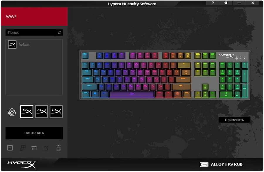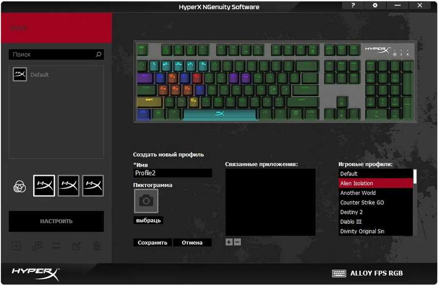 После подключения клавиатуры сразу советуем скачать программное обеспечение NGenuity с официального сайта. Интерфейс довольно дружелюбный и понятный. На стартовом экране нужно выбрать один из трёх профилей, в рамках которого и будет происходить изменение параметров. Потом эти профили можно переключать нажатием клавиш Fn + F1-F3 прямо во время работы или игры.