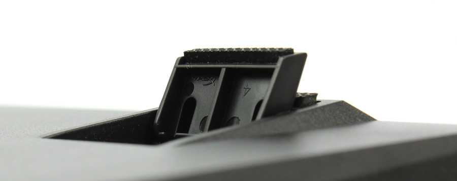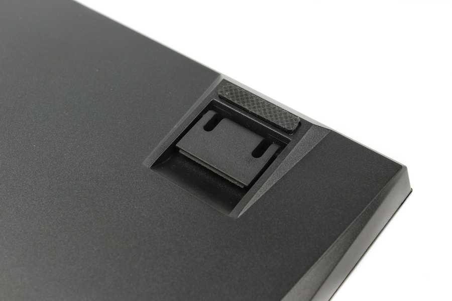 Кроме резиновых ножек есть и пластиковые откидывающиеся, с помощью которых можно изменить угол наклона клавиатуры. На них также имеются резиновые накладки, что улучшает устойчивость. Даже с откинутыми ножками, чтобы сдвинуть клавиатуру, нужно приложить усилие.