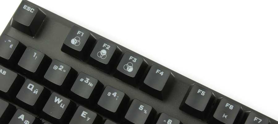 Раскладка клавиатуры стандартная. Enter «одноэтажный», но удлинённый, Shift с обеих сторон также остался длинным, что точно понравится геймерам. Цифровой блок и блок Ins/PgDn на своих местах. Отдельных мультимедийных кнопок не предусмотрено, но, по нашему мнению, это даже плюс. В геймерской клавиатуре не место лишним клавишам. Но чтобы не обижать любителей убавить звук или переключить трек прямо с клавиатуры, производитель нашёл компромисс – разместил мультимедийные функции на клавишах F1-F12, собственно, как и делают многие другие бренды. Чтобы воспользоваться мультимедийной функцией нужно нажать клавишу вместе с «Fn», ничего сложного. F1-F3 отвечают за работу с профилями, на них можно сохранить разные настройки и быстро их переключать даже во время игры. F6-F11 наделены стандартными функциями: переключить трек, поставить на паузу, отключить звук, прибавить или убавить громкость. Ну и F12, на которую разместили модную сейчас функцию отключения кнопки «Win», это так называемый игровой режим, чтобы во время боя вы случайно не свернули игру. Да, такие моменты бывают, и они очень огорчают геймеров, особенно тех, что играют с вами в команде.