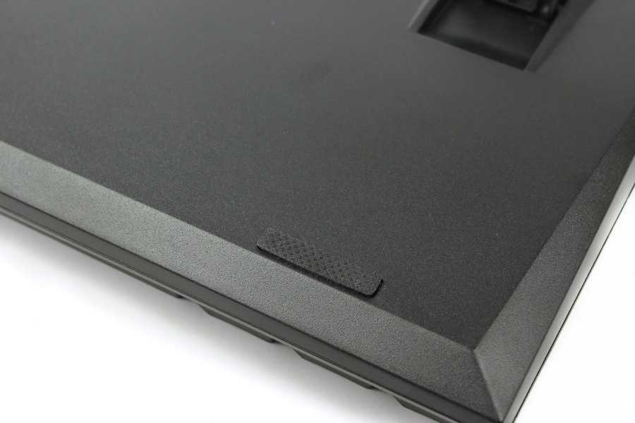 Основание клавиатуры ровное, выполнено из матового пластика. Попериметру находятся четыре небольшие резиновые ножки толщиной в пару миллиметров. Нужно отметить, что держатся они на клее, но сидят довольно надёжно — если специально не отрывать, то несколько лет прослужат, а потом и переклеить можно.