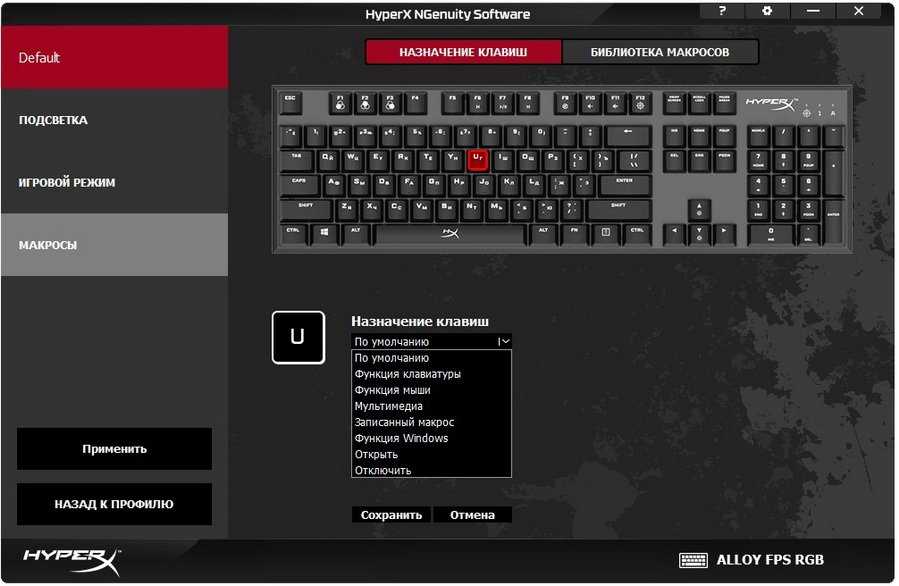 Назначение функции клавиши выбирается из доступного списка, либо же записывается полностью вручную.