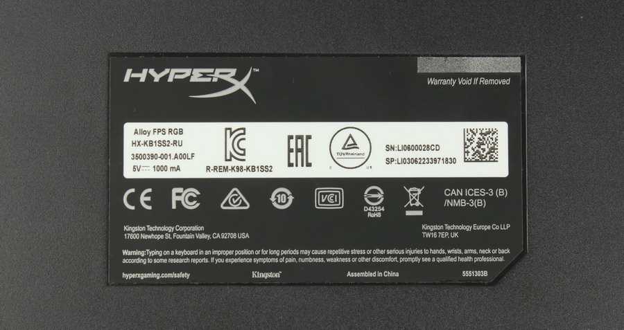 Последнее время, кампания Kingston пытается сделать свои новые клавиатуры всё проще и проще, при этом комплектуя их самым необходимым для комфортного гейминга. В комплекте с предыдущей моделью клавиатуры от Hyper шли фирменный чехол и дополнительные сменные клавиши, но, с моделью Alloy FPS, этих «плюшек» мы уже не увидим. Однако, остался съёмный провод и документы с наклейкой. Стоит добавить пару слов о проводе: сам он выполнен в тканевой оплётке и имеет мини USB со стороны клавиатуры и два USB Type-A с другого конца. Два их, кстати, потому что один их них необходим для работы порта на самой клавиатуре.
