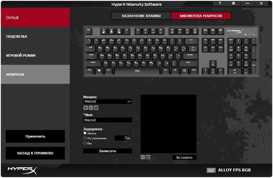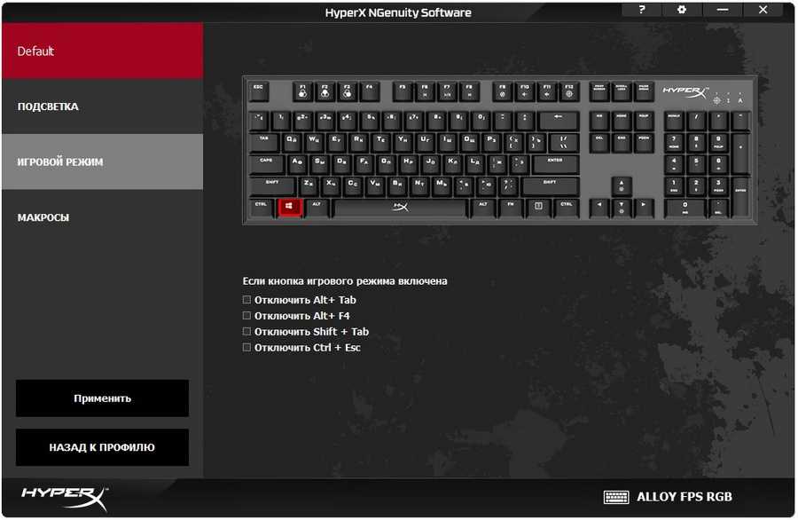 Подсветка – это, конечно, важная функция, но далеко не главная. В следующих разделах настраивается игровой режим, его включение может деактивировать нажатие разных клавиш (Alt, Tab, F4, Shift, Tab, Ctrl, Esc), а также назначение клавиш и макросы. Для продвинутых геймеров это будет наиболее интересно и полезно.