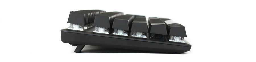 Со сложенными ножками самая высокая точка клавиатуры находится на уровне 36 мм, передний ряд клавиш чуть ниже – 32 мм. В таком положении печатать не очень удобно, поэтому мы использовали Alloy FPS RGB с откинутыми ножками. В этом случае верхняя точка корпуса – 44 мм, высота клавиш первого ряда – 33 мм.