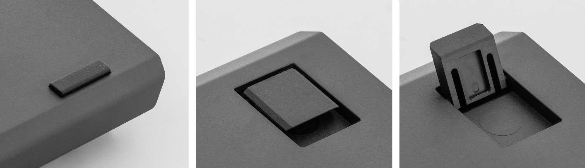 Раскладные подставки целиком прорезинены и в сложенном состоянии выступают за границы основания устройства — таким образом они исполняют роль тыльных ножек.