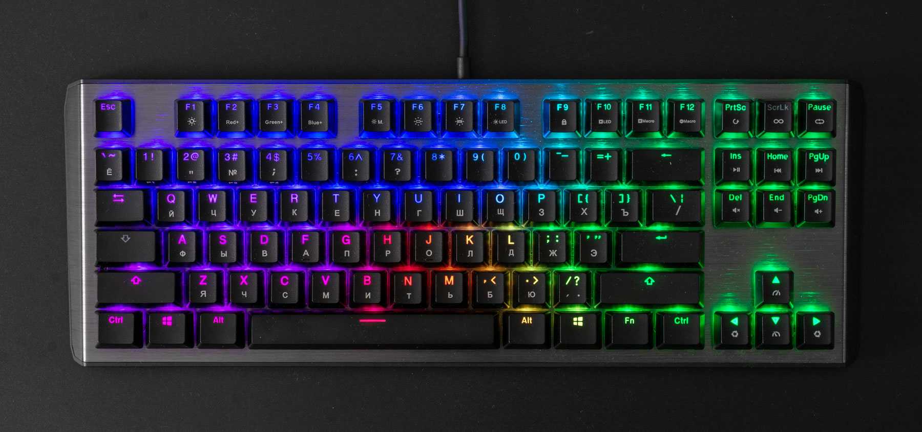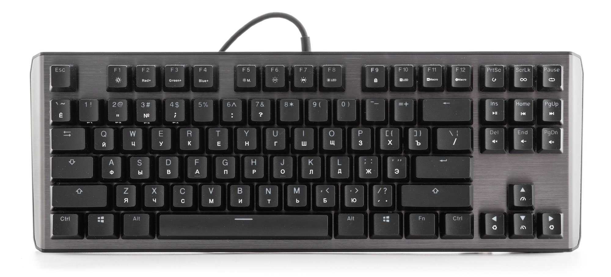 Кнопка F1 размещена над клавишей «2» пятого ряда. Колпачки Ctrl, Win и Alt имеют одинаковую ширину. Enter — одноуровневый, левый Shift — длинный. Клавиша контекстного меню отсутствует, вместо нее размещена вторая клавиша Windows.