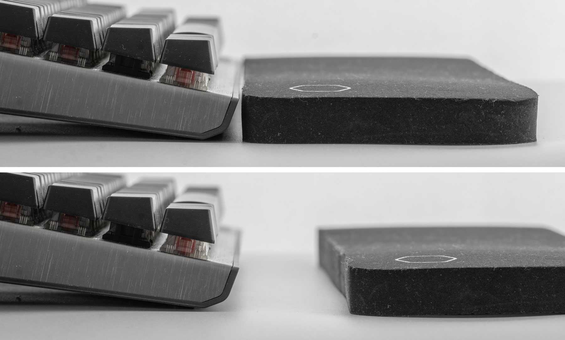 Если поместить подставку примерно в 5 см от корпуса, то запястья будут параллельно раскладке, что позволит еще дольше работать без усталости в запястьях.