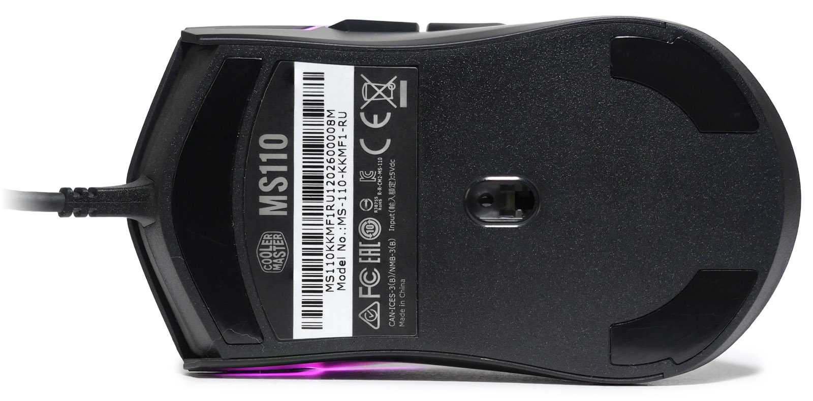 Фактура верхней и боковой частей отличается. В обоих случаях матовая поверхность одинаково приятна на ощупь, но бока почему-то сделаны более гладкими. В основании приклеены три крупных тефлоноподобных «ножки» для уверенного скольжения по различным поверхностям. Их толщины достаточно, чтобы на мягких ковриках мышь не цепляла дном поверхность.