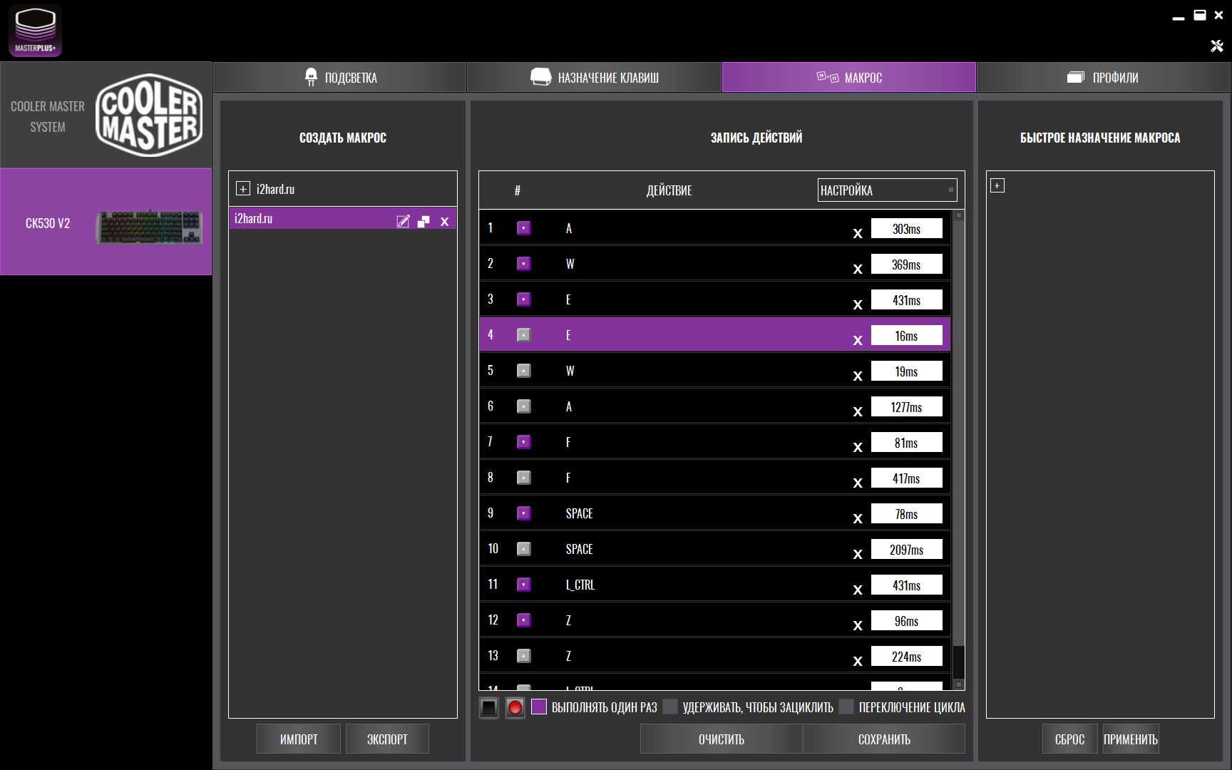 Запись на лету. Макросы можно записывать на лету, но в программе к ним нет доступа. Кроме того, в утилите не отмечаются клавиши, к которому привязаны макросы, записанные через комбинации клавиш.