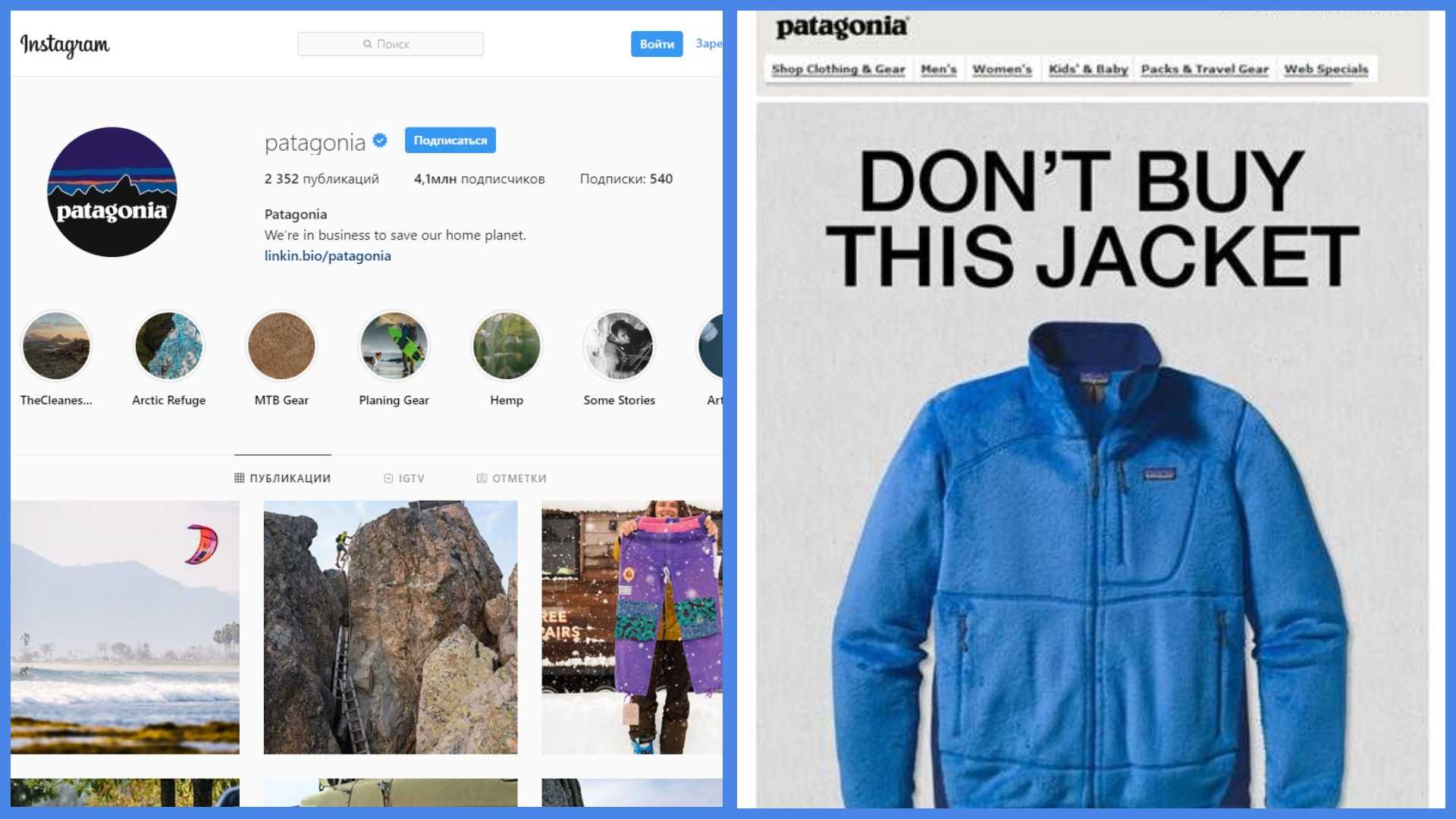Прежде всего отметим, что Patagonia никогда не рекламировалась на телевидении (за исключением нескольких экологических промороликов, не связанных с товарами). Все маркетинговые вложение бренда направлены на интернет и социальные сети, что уже вызывает интерес к опыту продвижения компании.