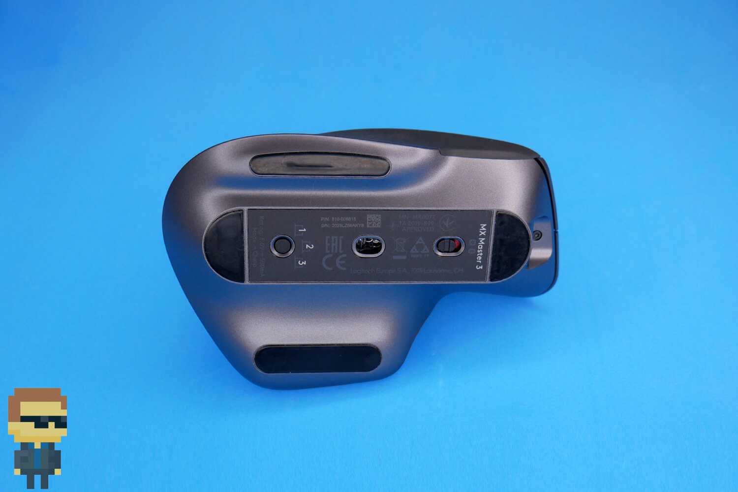 MX Master 3 for Mac довольно тяжёлая, что даже хорошо. Если мы её перевернём, то сможем найти три индикатора для переключения сопряжённых устройств, а также кнопку выключения. Спереди находится разъём USB-C для зарядки. Ещё одно выгодное отличие от Magic Mouse — мышь можно заряжать и использовать одновременно. Впрочем, вряд ли вы будете так делать: благодаря технологии быстрой зарядки, вам хватит всего пары минут для целого дня работы.