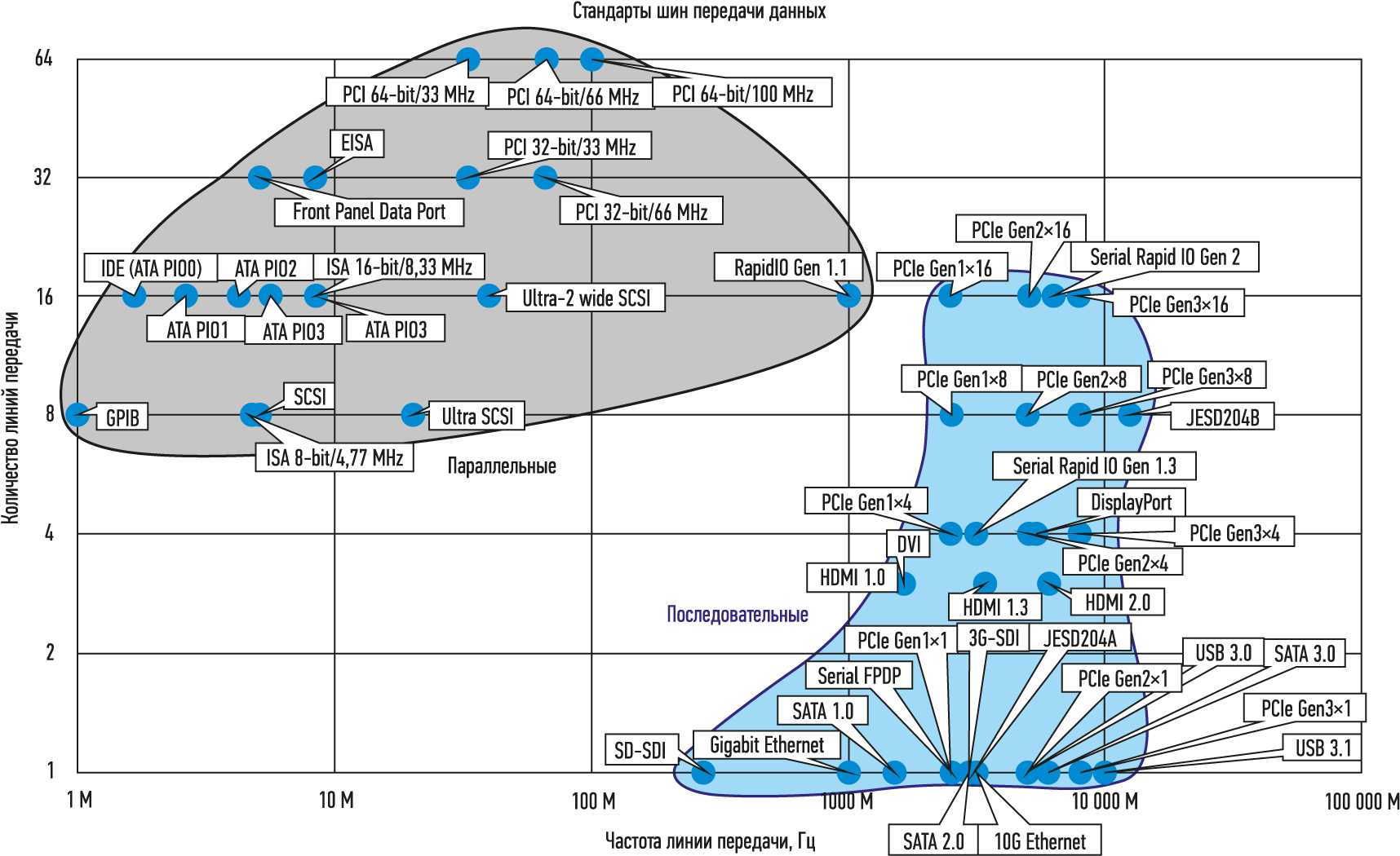 Рис. 2. Известные стандарты шин передачи данных с разбивкой по количеству линий передачи и тактовой частоте одной линии