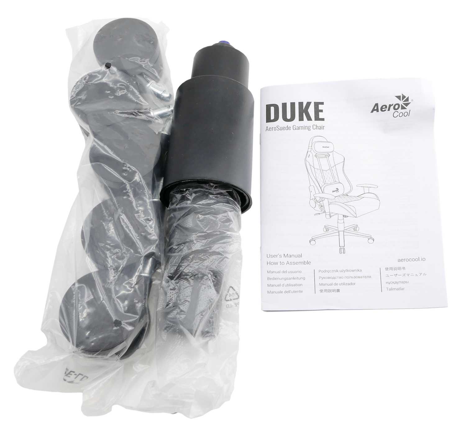 Внимательно разбирая упаковку, по мере изучения комплектации пользователь обнаружит необходимые части для сборки игрового кресла, которое для удобства транспортировки поставляется в разобранном состоянии. Дополнительный комплект можно разделить на три составляющие. В одну из них включены пять колес и газовый лифт.