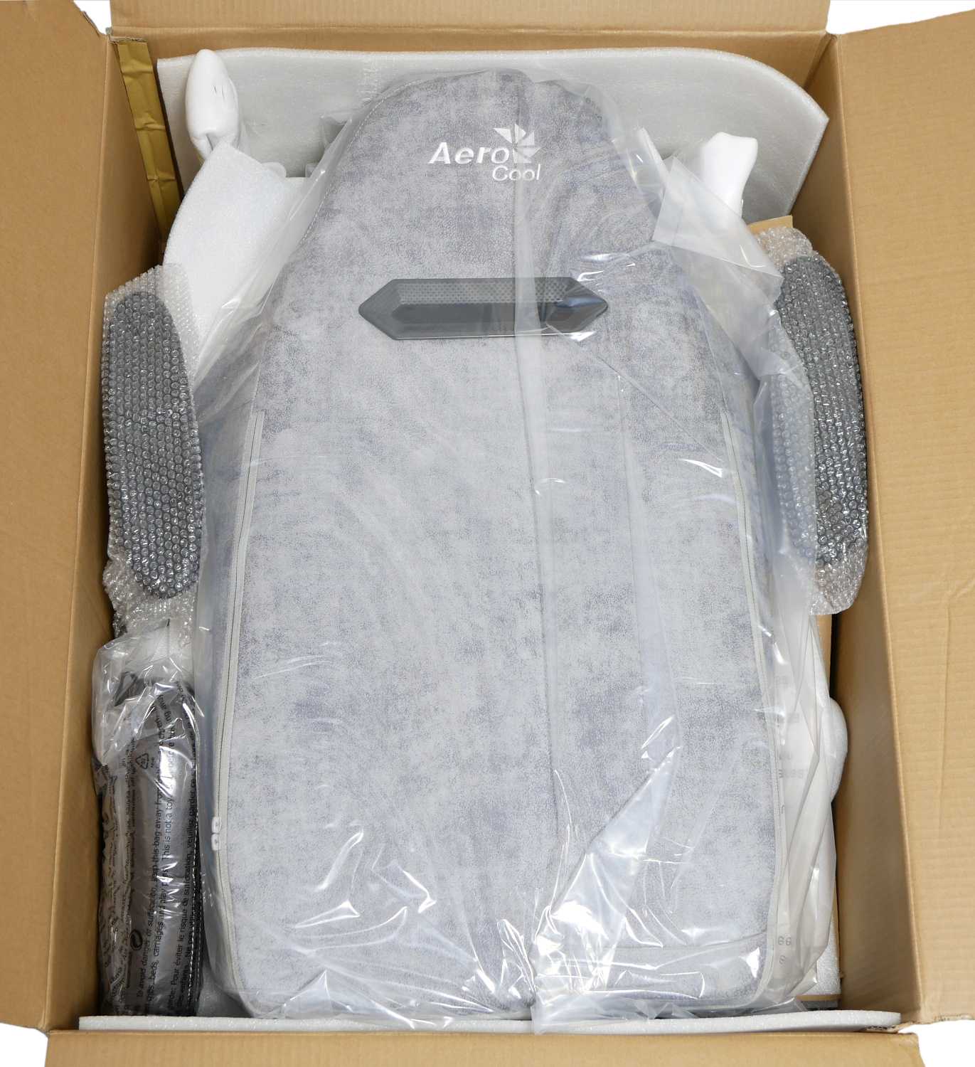 Детали игрового кресла запечатаны в индивидуальную упаковку. Разработчики позаботились о целостности элементов и дополнительно усилили боковые грани коробки картонными вставками и листами вспененного материала.