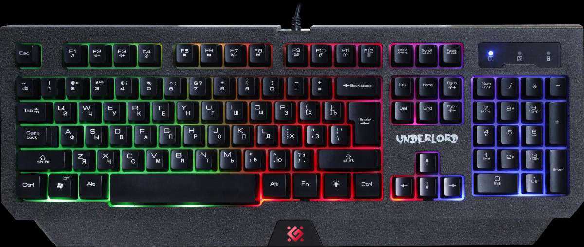 Клавиатура DEFENDER Underlord GK-340L имеет стильный, инновационный дизайн, соответствующий атмосфере современных игр. Ее покрытие создает ощущения комфорта и способствует точному попаданию по клавишам. Клавиши быстро реагируют на малейшее касание, предвосхищая вашу реакцию на игровую обстановку. Созданная для геймеров клавиатура имеет все преимущества для комфортного расположения рук, подсветку, соответствующую вашему настроению и ходу игры, которую при желании можно отключить или уменьшить ее яркость. Клавиатура DEFENDER Underlord GK-340L имеет влагоустойчивую конструкцию. Огромный ресурс износостойкости позволит вам пользоваться ей долго и часто.
