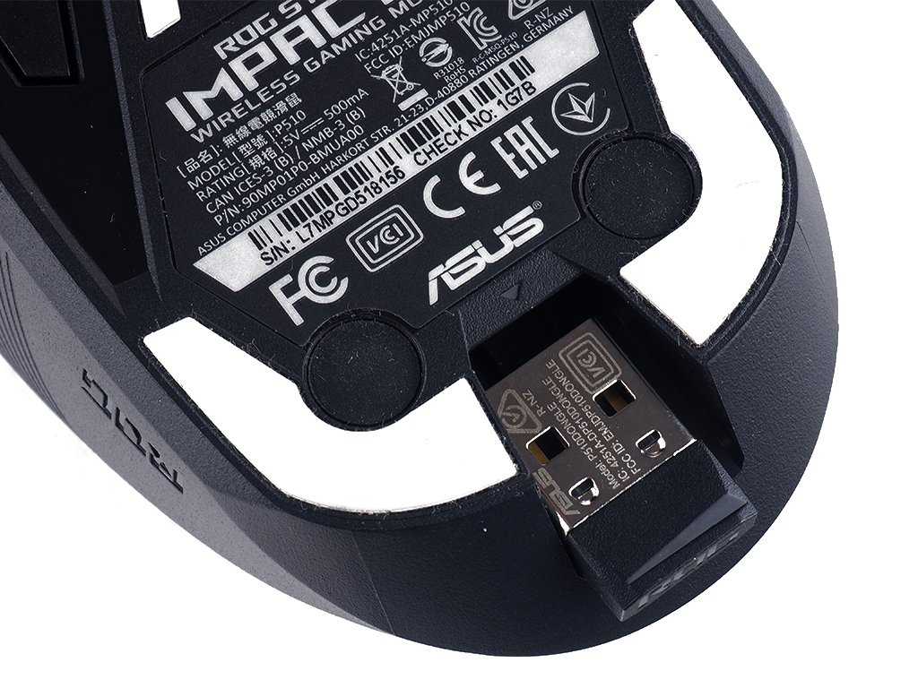 Так как у нас мышь беспроводная, инженеры ASUS позаботились о месте для хранения USB dongle, за что им человеческое спасибо. Отсек для хранения находится в задней части основания мыши. Это удобно, а главное — безопасно, чтобы не потерять один из важных элементов манипулятора.