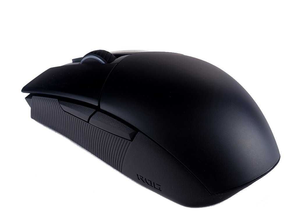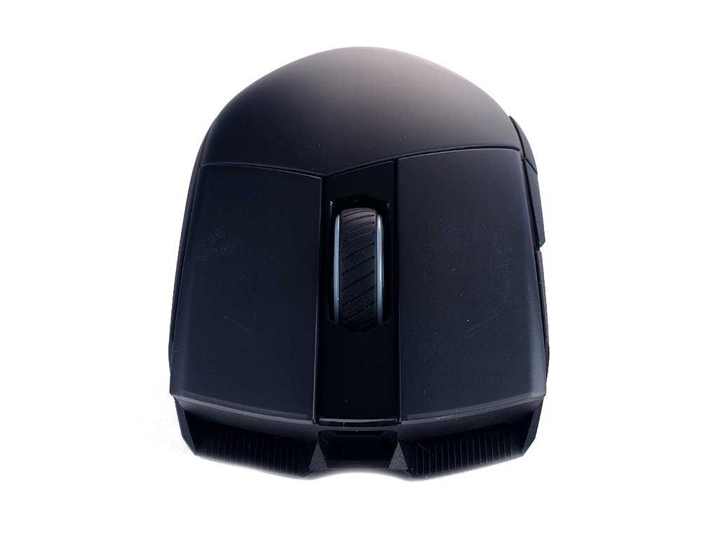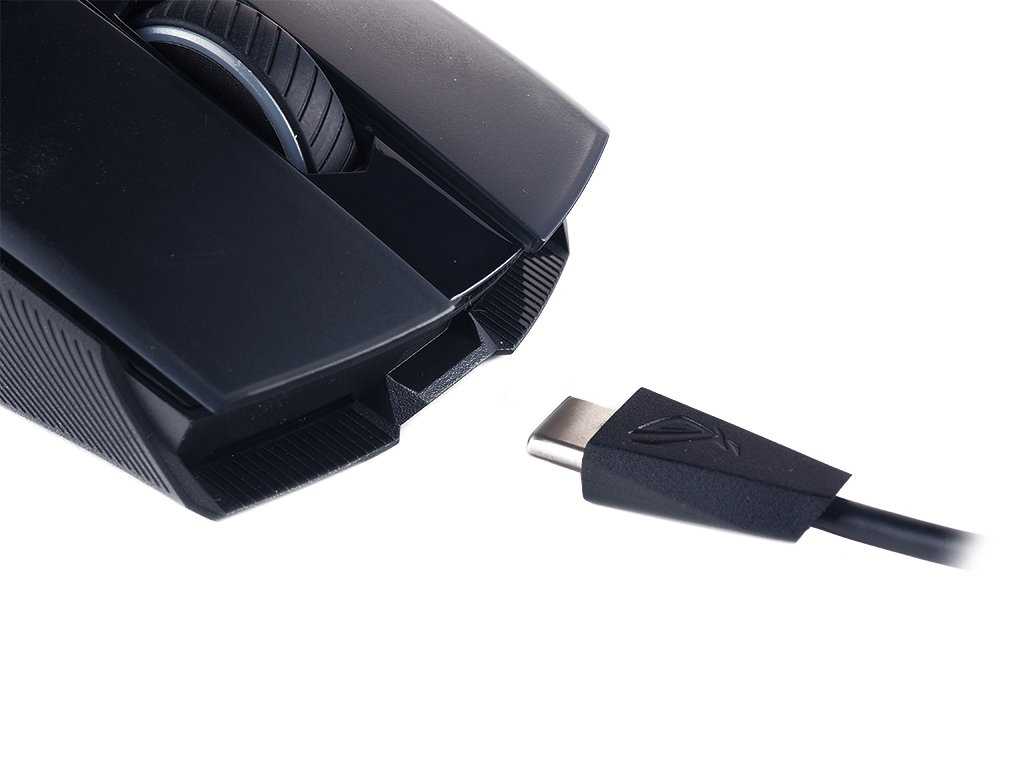 Элементы скомпонованы стандартным образом. Сверху есть ЛКМ и ПКМ с колесом с подсветкой по центру. Чуть ниже — логотип ROG, также с RGB-подсветкой. На левом торце расположены две боковые клавиши с шероховатой поверхностью, а справа — только глянцевое тиснение ROG. Спереди находится порт USB-C и он находится чуть выше, чем обычно у разных мышек, и сделано это для уменьшения трения кабеля по столу или коврику.