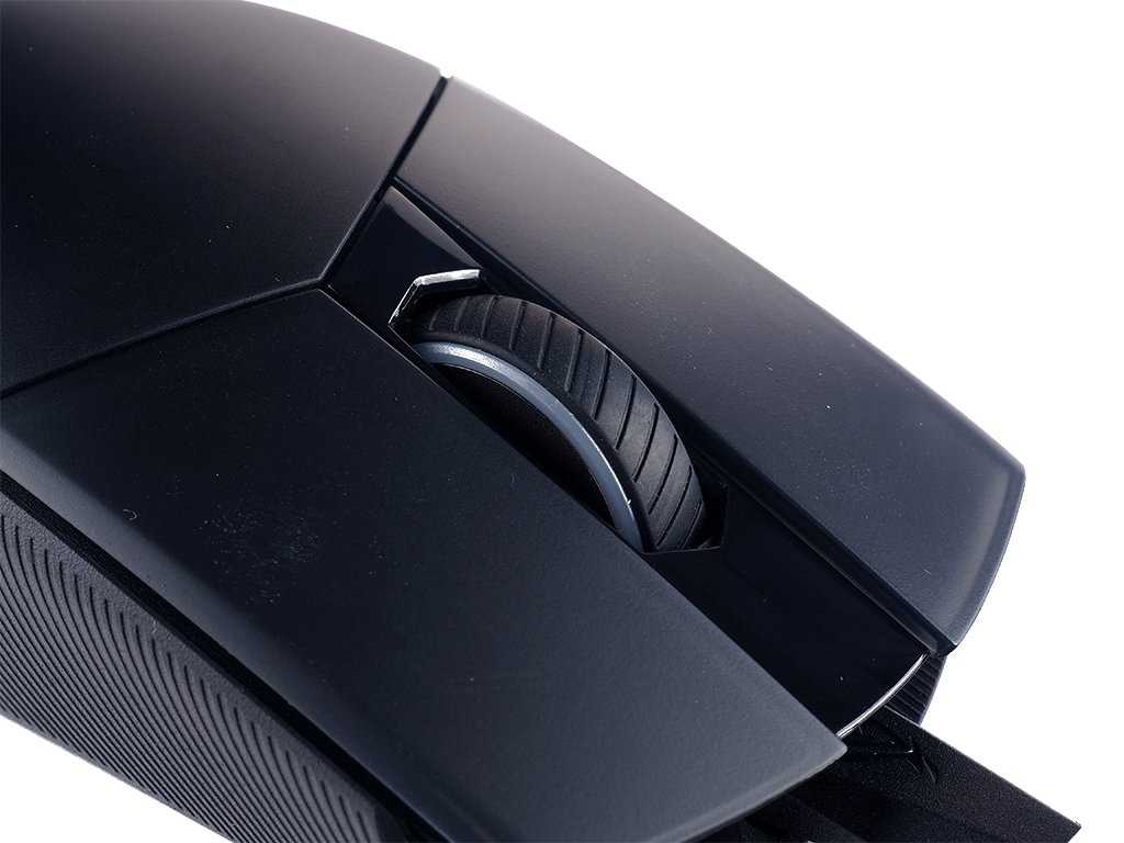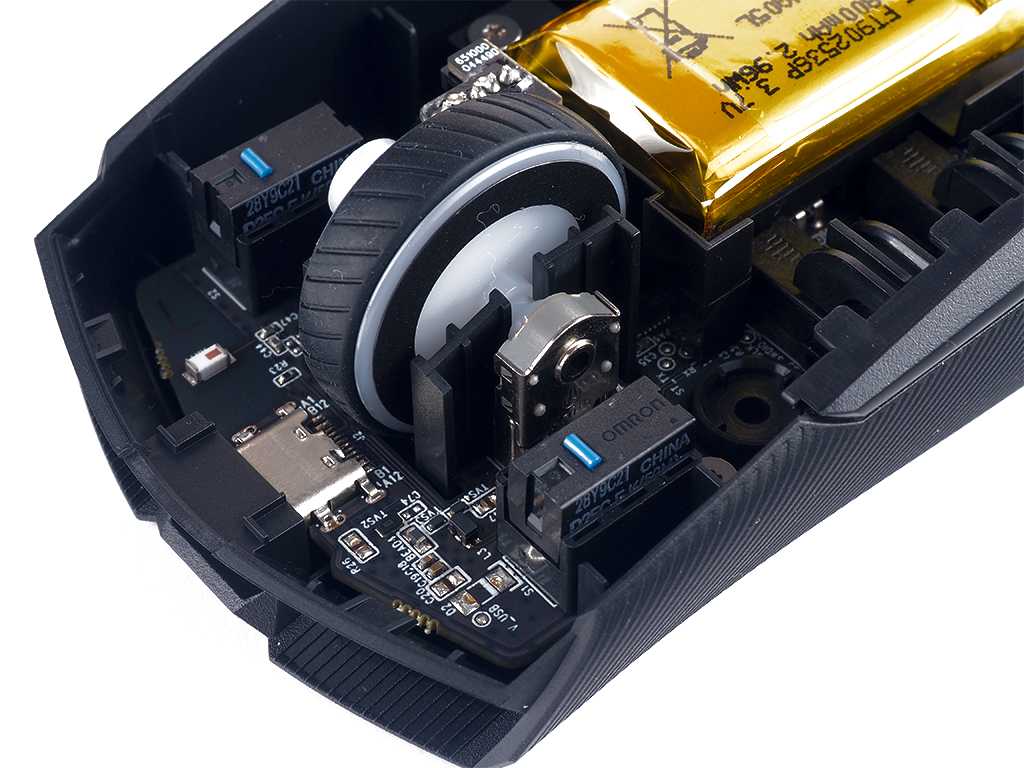 Широкое прорезиненное колесо скроллинга обладает мягким ходом и работает на базе энкодера Kailh 11. Кнопка смены чувствительности находится на нижней части корпуса.