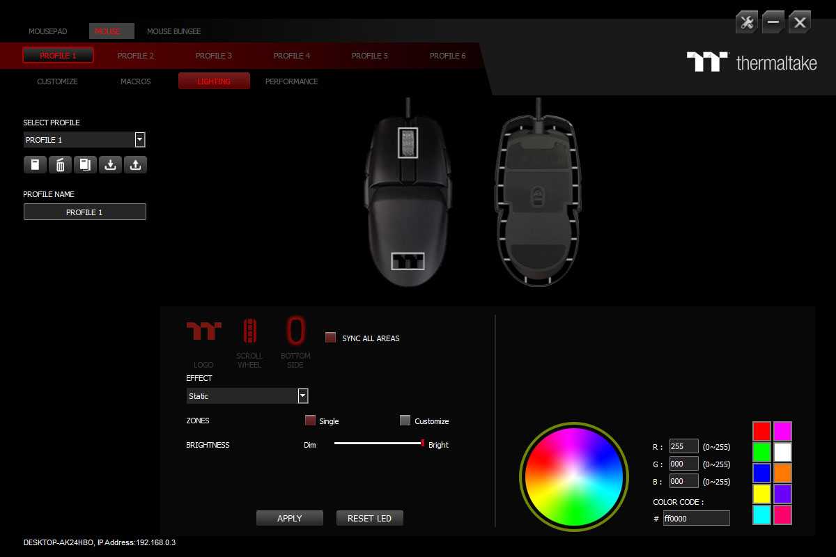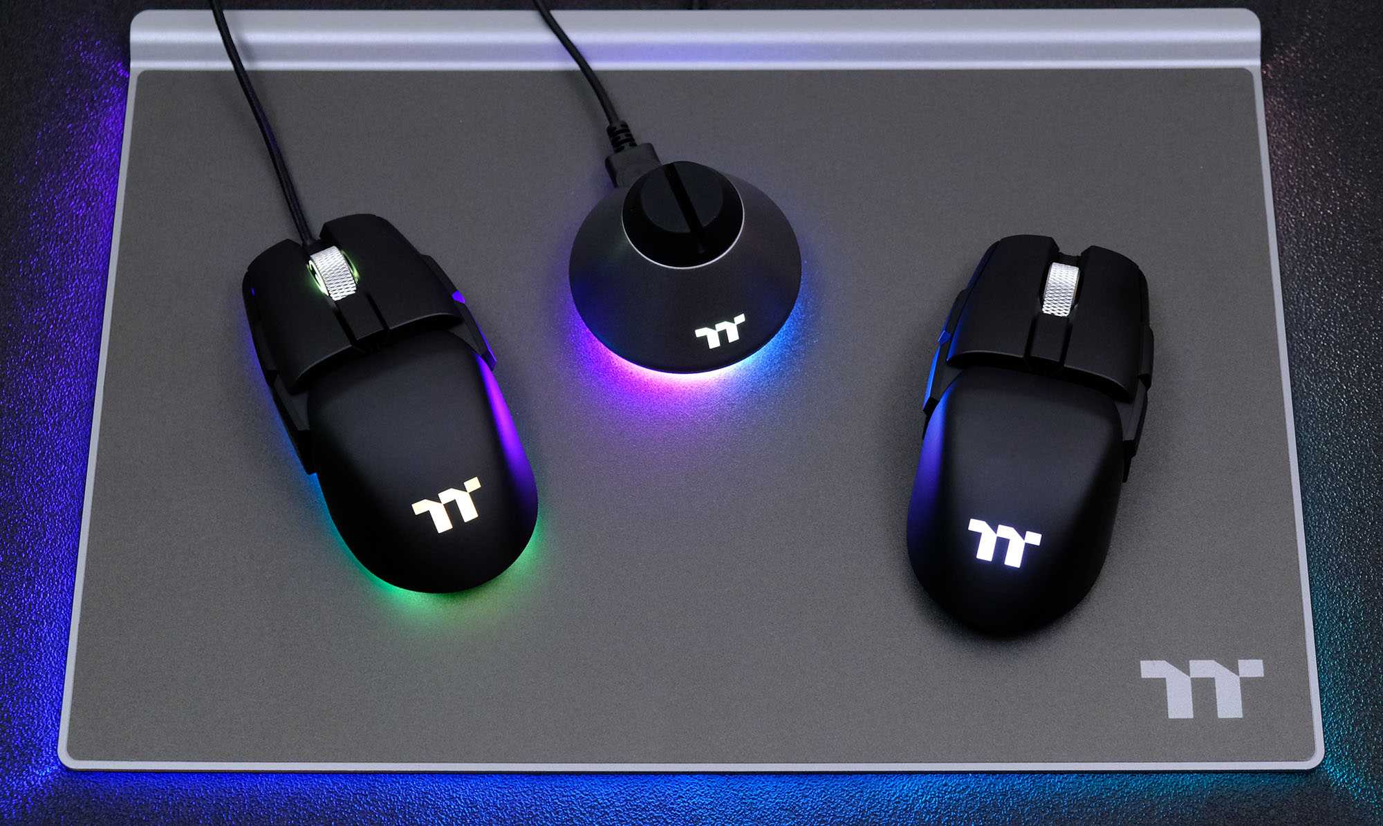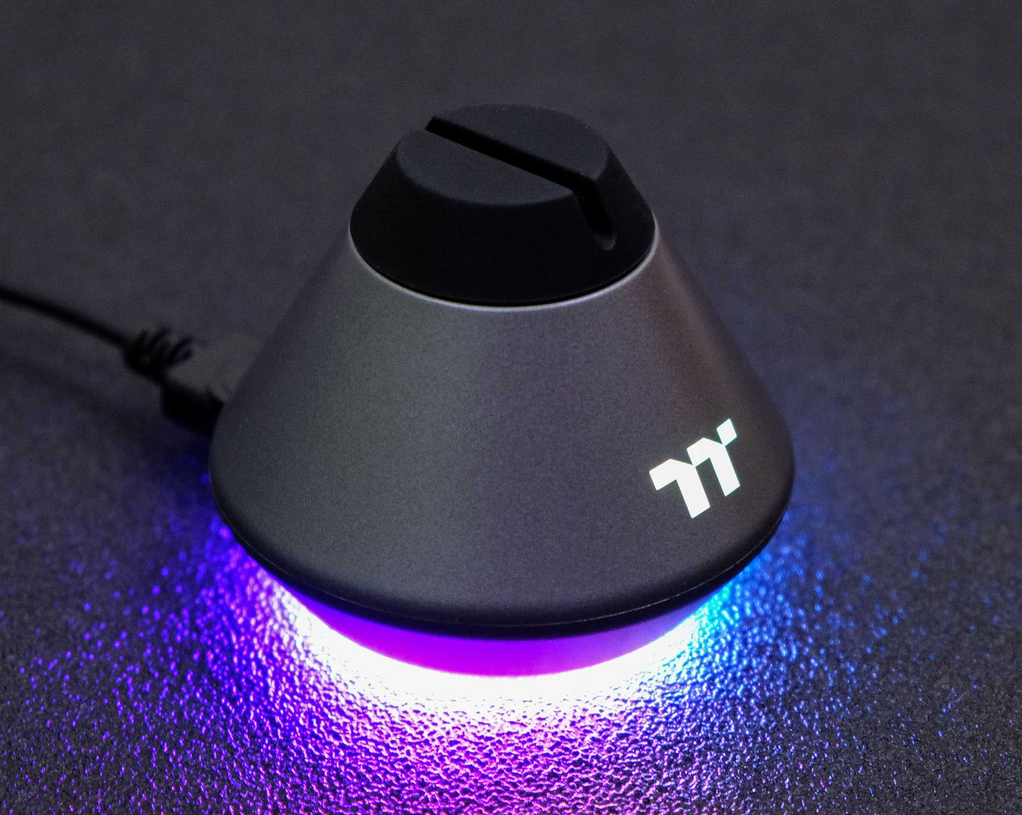 Так как реализовано ARGB, зоны подсветки можно настраивать адресно – отдельные кластеры отмечены на панели управления. У всех девайсов можно задать разным зонам разные цвета, также доступен выбор примерно из десятка динамических эффектов. У мышек также есть 3 разные зоны: колёсико, нижняя подсветка (для проводной версии) и подсветка букв логотипа TT сверху.