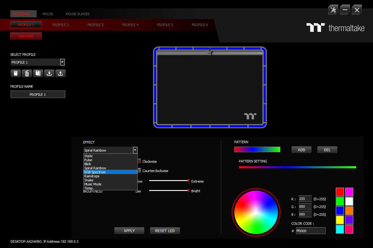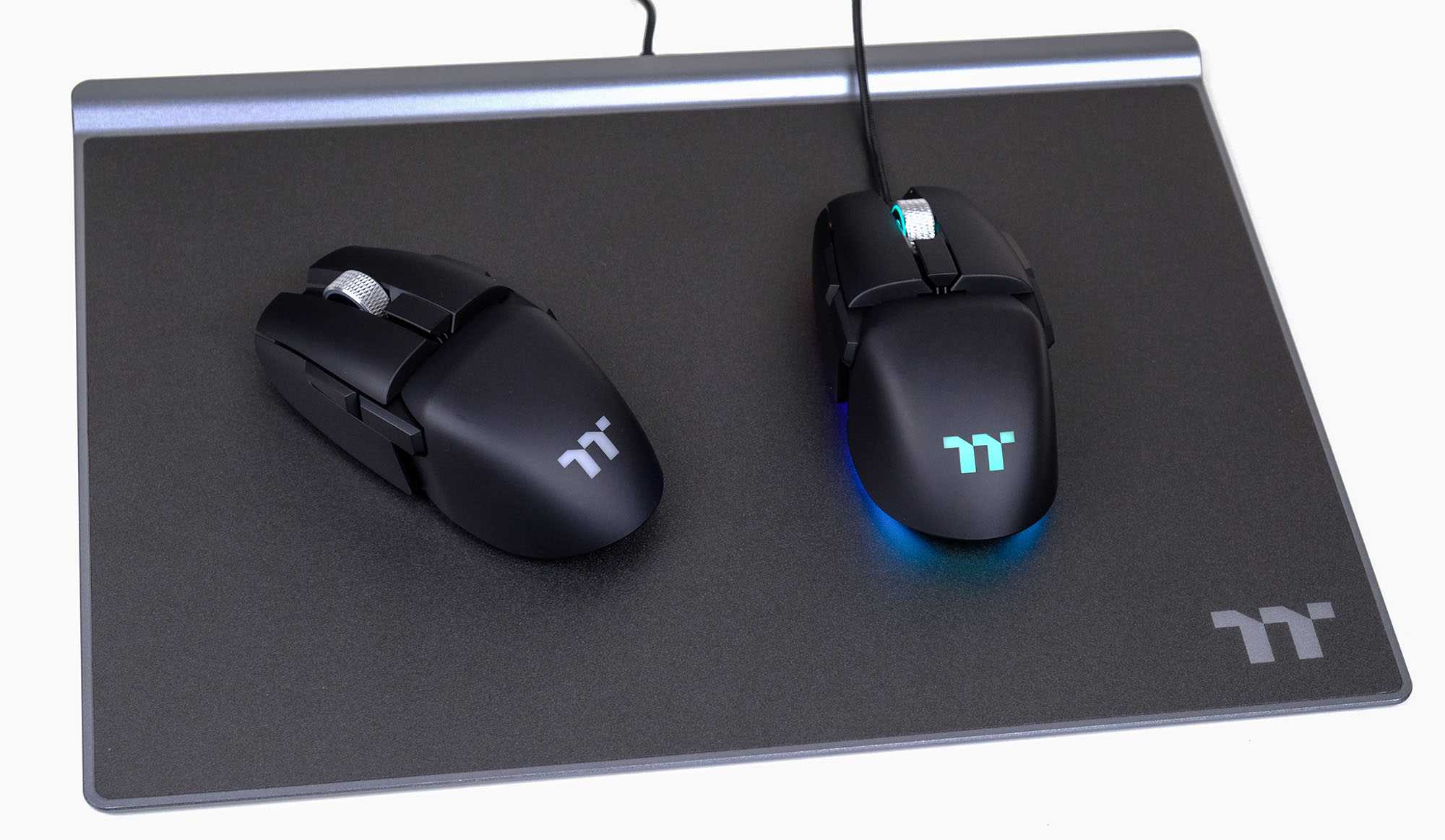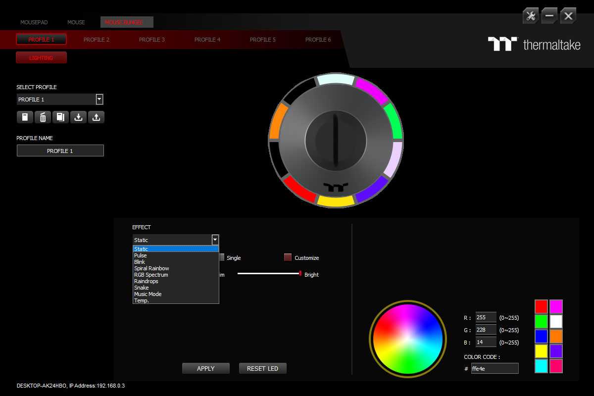 Так как реализовано ARGB, зоны подсветки можно настраивать адресно – отдельные кластеры отмечены на панели управления. У всех девайсов можно задать разным зонам разные цвета, также доступен выбор примерно из десятка динамических эффектов. У мышек также есть 3 разные зоны: колёсико, нижняя подсветка (для проводной версии) и подсветка букв логотипа TT сверху.
