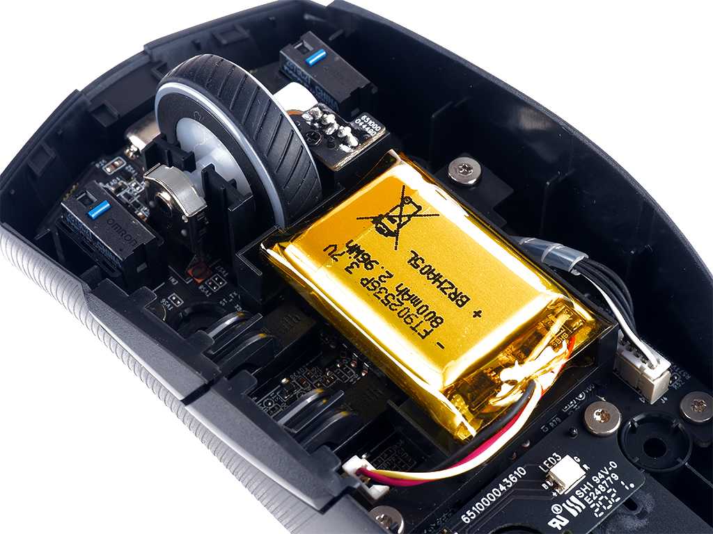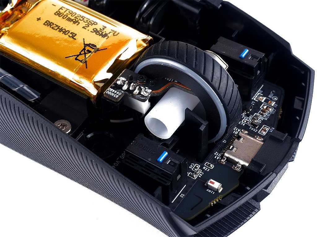 Внутренний конструктив манипулятора аккуратен и компактен. В центральной части сразу заметен самый большой элемент – аккумулятор ёмкостью 800 мАч или 2.96 Втч. Такого объема хватает на длительное время с учетом отключенной подсветки.
