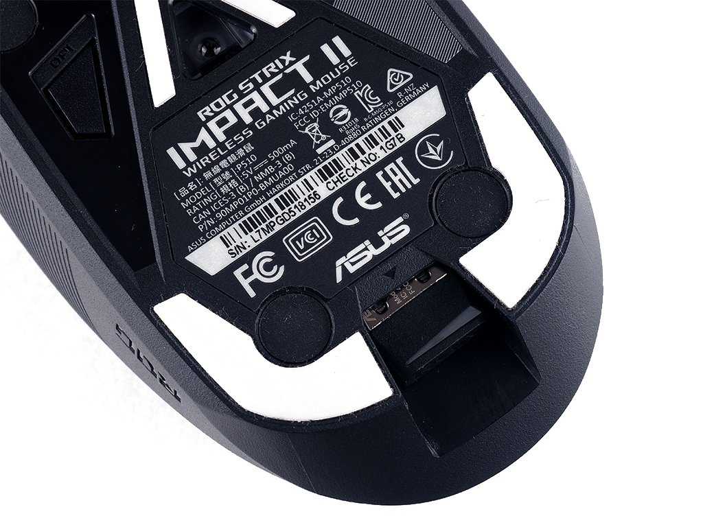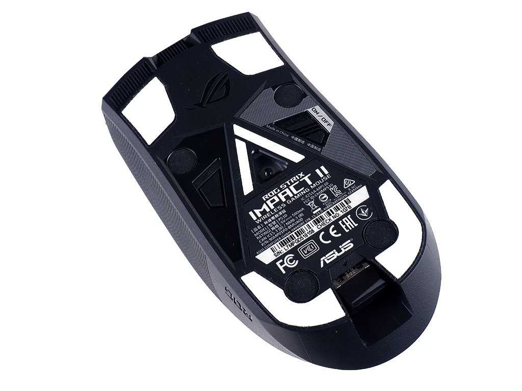Снизу есть информационный стикер, четыре тефлоновые ножки ROG Omni Mouse по углам и кольцевая по центру вокруг оптического сенсора. Рядом с последним слева находятся две круглые кнопки: для изменения DPI и нового подключения по Bluetooth, а справа — трехпозиционный тумблер с выбором интерфейса соединения мыши с устройством. Чуть ниже есть две резиновые заглушки, за которыми спрятаны винтики для снятия верхней части мыши и доступа ко всем внутренностям «грызуна». И ещё ниже — посадочное место для беспроводного адаптера, если он не используется, или же просто для удобной транспортировки, дабы его не потерять.
