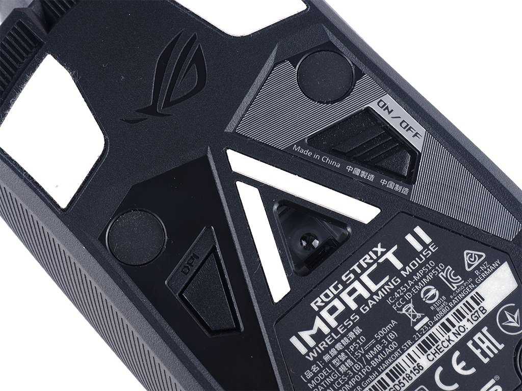 Хотя модель ROG Strix Impact II Wireless является симметричной, боковые кнопки расположены с левой стороны, что четко ориентирует эту модель для тех игроков, которые играют в основном правой рукой. Трапециевидные кнопки немного выступают из корпуса и легко находятся большим пальцем правой руки. Клик заметный, но приглушенный.