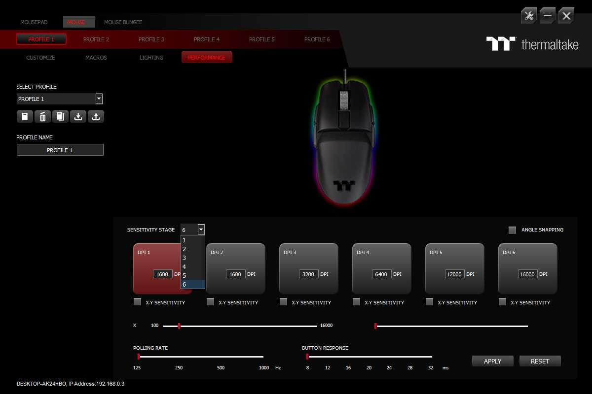 Раздел «производительность» создан, чтобыподогнать мышку под себя с достаточно большой детализацией. Регулировка чувствительности сенсора с шагом 50 сpi. Степень угловой привязки, частота опроса от 125 до 1 000 Гц, ускорение или замедление курсора и возможность настройки скорости реакции кнопок.